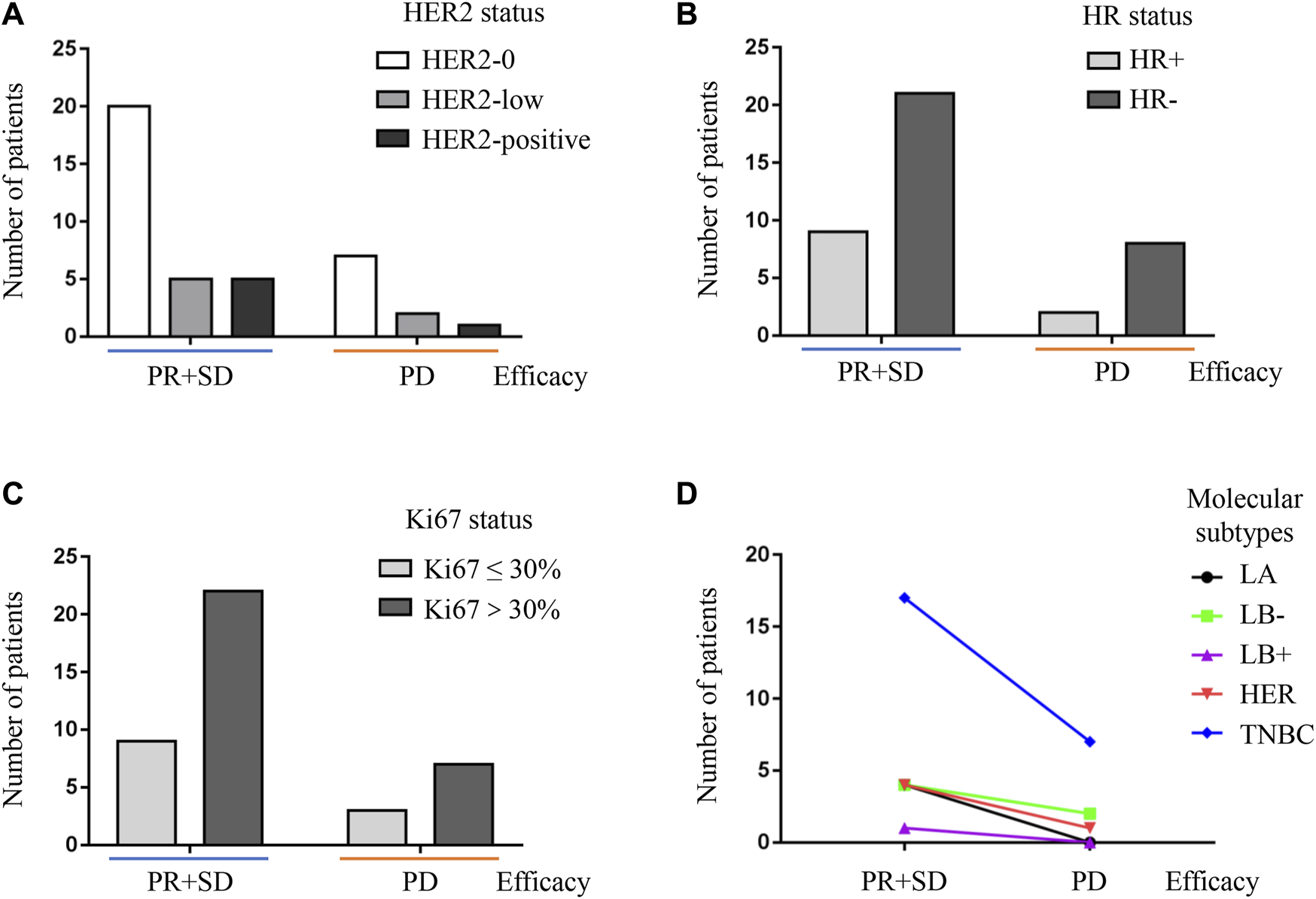 The molecular subtypes of primary breast cancer contained luminal A, luminal B (HER2-positive and HER2-negative), HER2-overexpression, and TNBC. The subtypes of all non-TNBC patients were changed into TNBC when breast cancer relapsed or metastatic, based on the pathological confirmation of metastatic tumors. For the molecular subtypes of primary breast cancer during early stage, 27.5% of patients had high expression of estrogen receptors (ER, ≥1%) or progesterone receptors (PR, ≥1%). The ratios of patients with different HER2 expression were 67.5% for HER2-negative (HER2 0), 17.5% for HER2-low (IHC 1+ or IHC 2+/FISH-negative), and 15.0% for HER2-positive (IHC 2+/FISH-positive or HER2 3+). In addition, 70.0% of patients had high expression of Ki67 (>30%). Five cases of patients (12.5%) were diagnosed with de novo stage IV breast cancer. According to the tumor-node-metastasis staging system (TNM staging system), the proportion of patients with breast cancer of stage I, stage II, and stage III was 20.0%, 20.0%, and 47.5%, respectively. Breast cancer of most patients (92.5%) was histologically grade II and grade III. For the locations of cancer metastasis, 9.6% of patients suffered from brain metastasis including cerebrum and cerebellum, and 40.4% of patients had visceral metastases including lung (16.7%), liver (13.1%), serosa and serous effusion (8.8%), pancreas (0.9%),and bladder (0.9%). Non-visceral metastases were found located in lymph nodes, thoracic wall, breast, eye socket, skin, and soft tissue (Table 1).