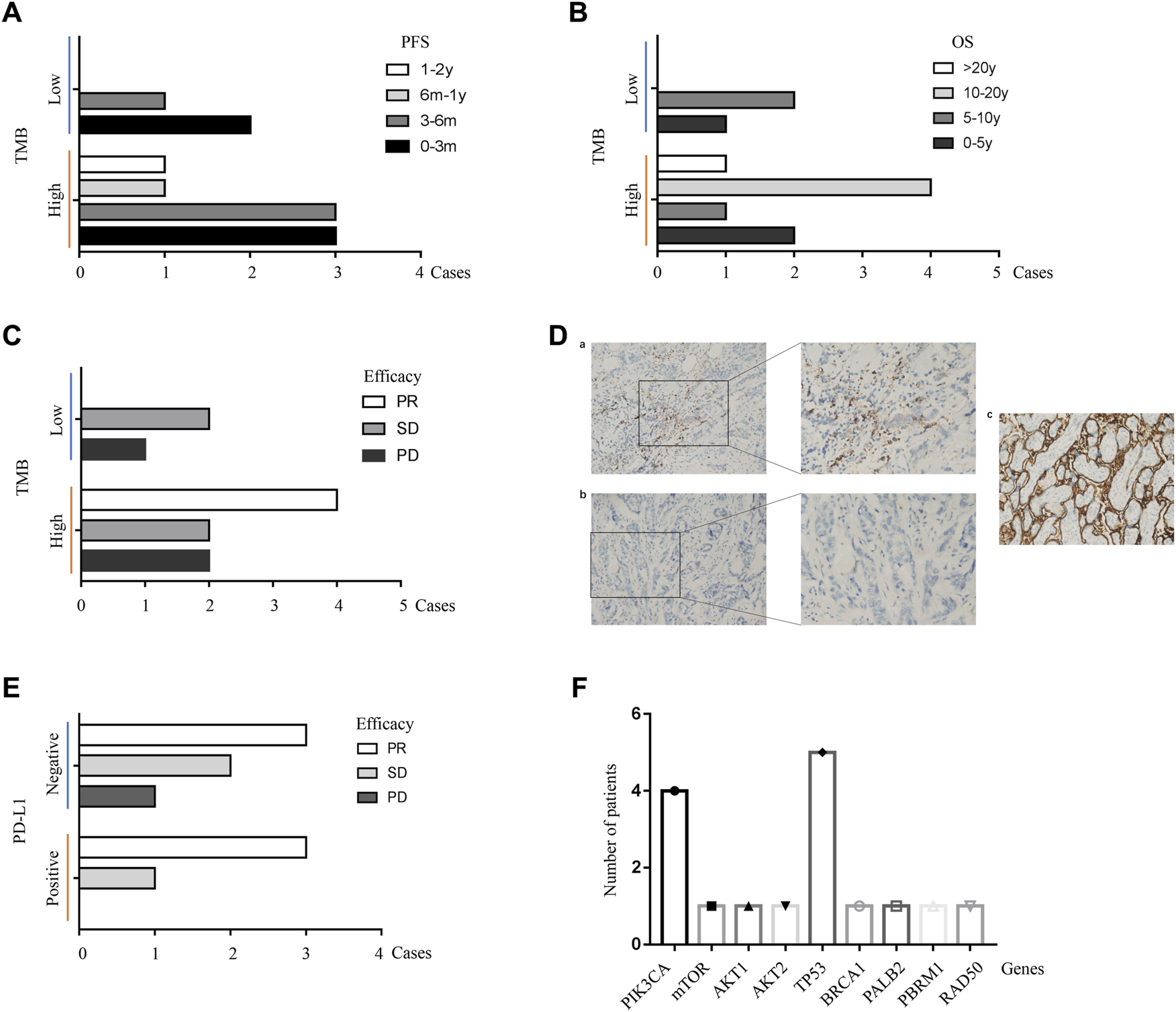 TNBC is a highly heterogeneous cancer with unique TME including special mutations and aberrant regulation of immunity. It is suitable for immunotherapy mainly due to tumor immune infiltration, neoantigens caused by mutational burden and higher genomic instability, and high levels of immune markers, which are closely correlated with tumor response, relapse, and overall outcomes. In this study, based on evaluated TMB data in 11 cases of patients, better prognosis of PFS and OS was found in TMB-high carrier. Similarly, to the literature of other ICIs reported, patients with PD-L1-positive tumor in this study gained more favorable treatment response from sintilimab than patients with PD-L1-negative tumor. It was suggested that TMB status and PD-L1 expression could be potential markers for predicting prognostic and effective benefit from treatment of sintilimab, but it may take a large amount of population to make the further verification. For the analysis of microsatellite instability, no patient was found with MSI-high metastatic breast cancer. Moreover, two patients were shown to have mutation of HRD genes (BRCA1 and PALB2). Even for patients with TNBC, the mutations of TP53 (12.5%, 5/40) and PIK3CA (10%, 4/40) gene were more frequently detected compared to other genes.