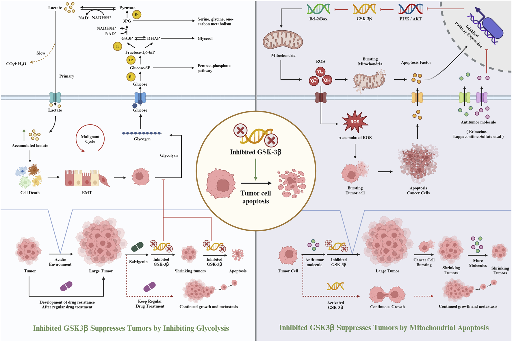 Research into therapies targeting GSK-3β has produced divergent outcomes. Studies have revealed that both inhibition and activation of GSK-3β can significantly impact tumor initiation and progression. Empirical investigations have confirmed GSK-3β′s involvement in a wide spectrum of malignancies, including prostate, colorectal, gastric, pancreatic, liver, ovarian, osteosarcoma, leukemia, non-small cell lung, bladder, thyroid, glioma, kidney cancers, and other malignant tumors. Cellular and tissue analyses consistently demonstrate the abundant expression of GSK-3β in these cancers, underscoring its potential as a key target in cancer therapy (R, 2010), This shows that GSK-3β is significantly related to the occurrence and development of these tumors. Interestingly, several investigations have demonstrated that GSK-3β can impede the progression, expansion, and spread of cancerous tumors like cutaneous carcinoma, oral carcinoma, laryngeal carcinoma, esophageal carcinoma, mammary carcinoma, salivary gland carcinoma, nasopharyngeal carcinoma, and melanoma (R, 2010), low expression of GSK-3β was detected in cells and tissues of these tumors.