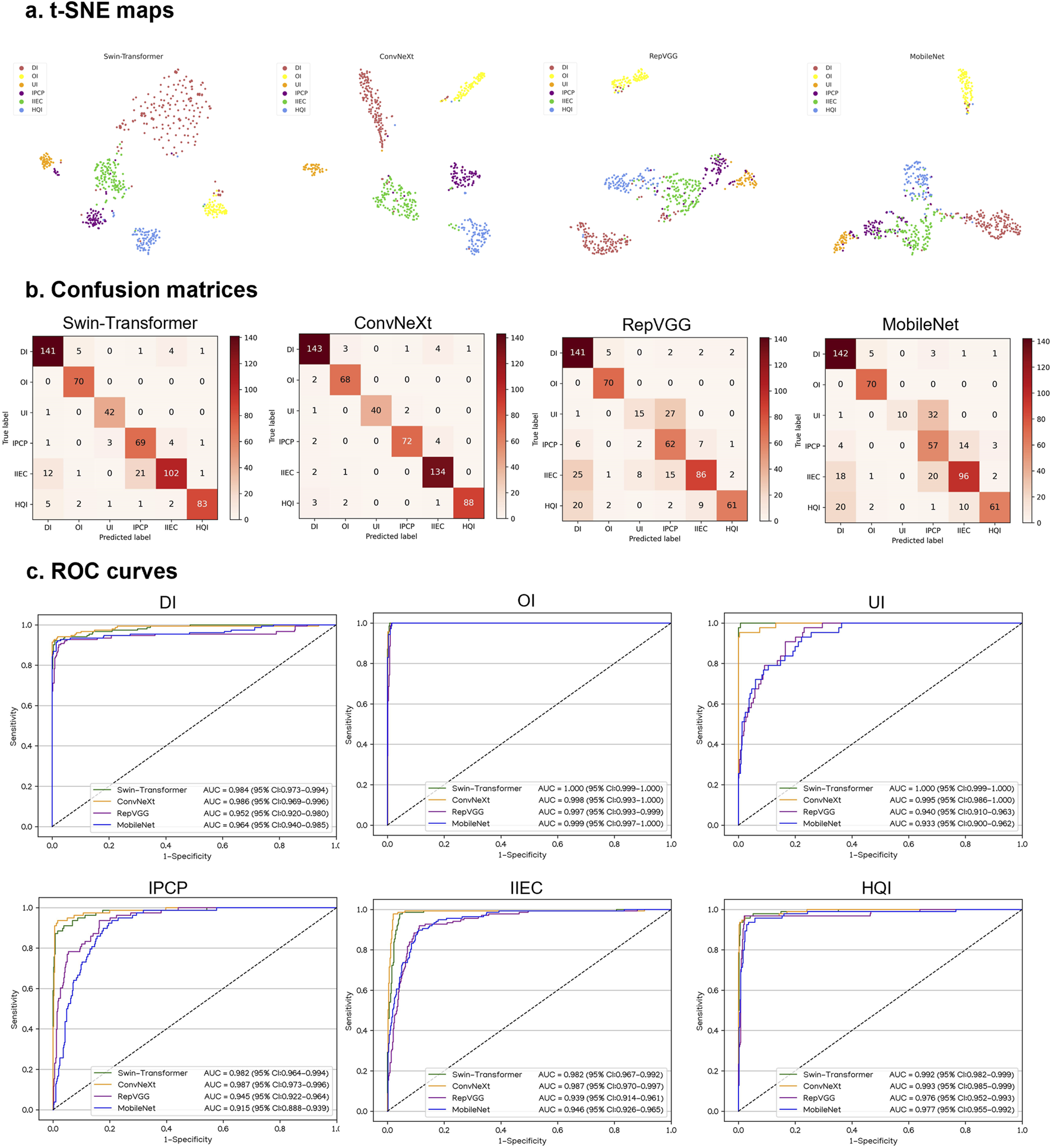 Performance of four different types of deep learning algorithms in an internal testing set. (A), t-distributed stochastic neighbor embedding (t-SNE) maps. (B), Confusion matrices. (C), Receiver operating characteristic (ROC) curves; AUC, area under the curve; DI, defocused image; OI, overexposed image; UI, underexposed image; IPCP, image of poor cornea position; IIEC, image of incompletely exposed cornea; HQI, high-quality image.