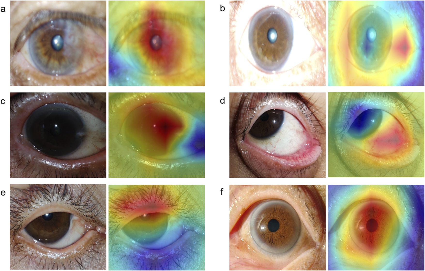 Typical heatmap examples of a defocused image, overexposed image, underexposed image, image of poor cornea position, image of incompletely exposed cornea, and high-quality image. The original image (left) and its corresponding heatmap (right) of each class are presented in pairs. (A), defocused image. (B), overexposed image. (C), underexposed image. (D), image of poor cornea position. (E), image of incompletely exposed cornea. (F), high-quality image.