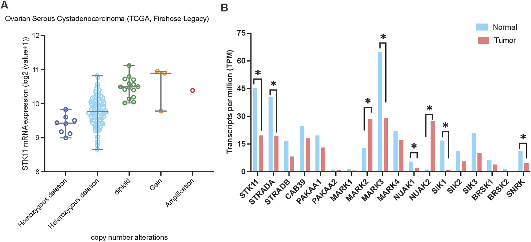 Figure 4. LKB1 copy number alterations and mRNA expression in ovarian cancer. (A) LKB1 mRNA expression levels in ovarian serous cystadenocarcinoma correlate with LKB1 copy number alterations. The data was assessed from cBioPortal (www.cbioportal.org). (B) The mRNA expression level of the genes involved in LKB1 signaling in ovarian cancer. The data was assessed from GEPIA on 5th June 2024.