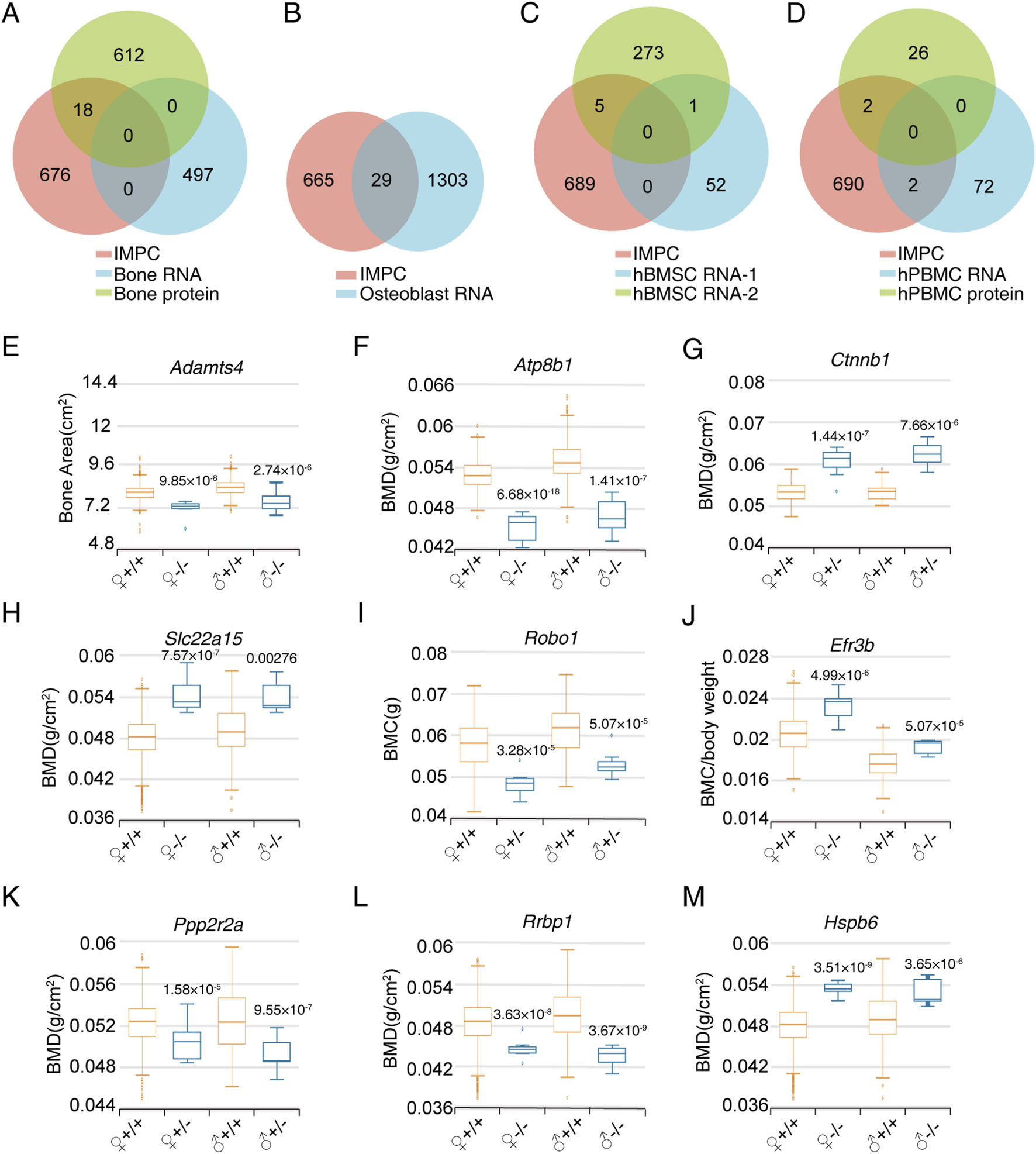 Figure 2. Screening of bone phenotype-related genes in specific cell types based on omics data. (A) Venn diagram of IMPC bone phenotype-related genes and differentially expressed genes in bone tissue proteome and RNA transcriptome. (B) Venn diagram of differentially expressed genes between IMPC bone phenotype-related genes and osteoblast RNA transcriptome. (C) Venn diagram of differentially expressed genes between IMPC bone phenotype-related genes and BMSC RNA transcriptome. (D) Venn diagram of differentially expressed genes between IMPC bone phenotype-related genes and PBMC proteome and RNA transcriptome. (E–M) Bone phenotype statistical data of the final candidate genes through limited P value screening. The sample numbers for every group were as follows. ADAMTS4: 633, 7, 595, 8; ATP8B1: 352, 8, 369, 8; CTNNB1: 30, 10, 38, 12; SLC22A15: 2,241, 7, 2,192, 7; ROBO1: 324, 8, 321, 8; EFR3B: 470, 8, 488, 8; PPP2R2A: 418, 7, 410, 7; RRBP: 2,633, 7, 2,574, 8; HSPB6: 2,241, 8, 2,192, 8. Values represent the mean ± SD, the P-values are represented in the figure.