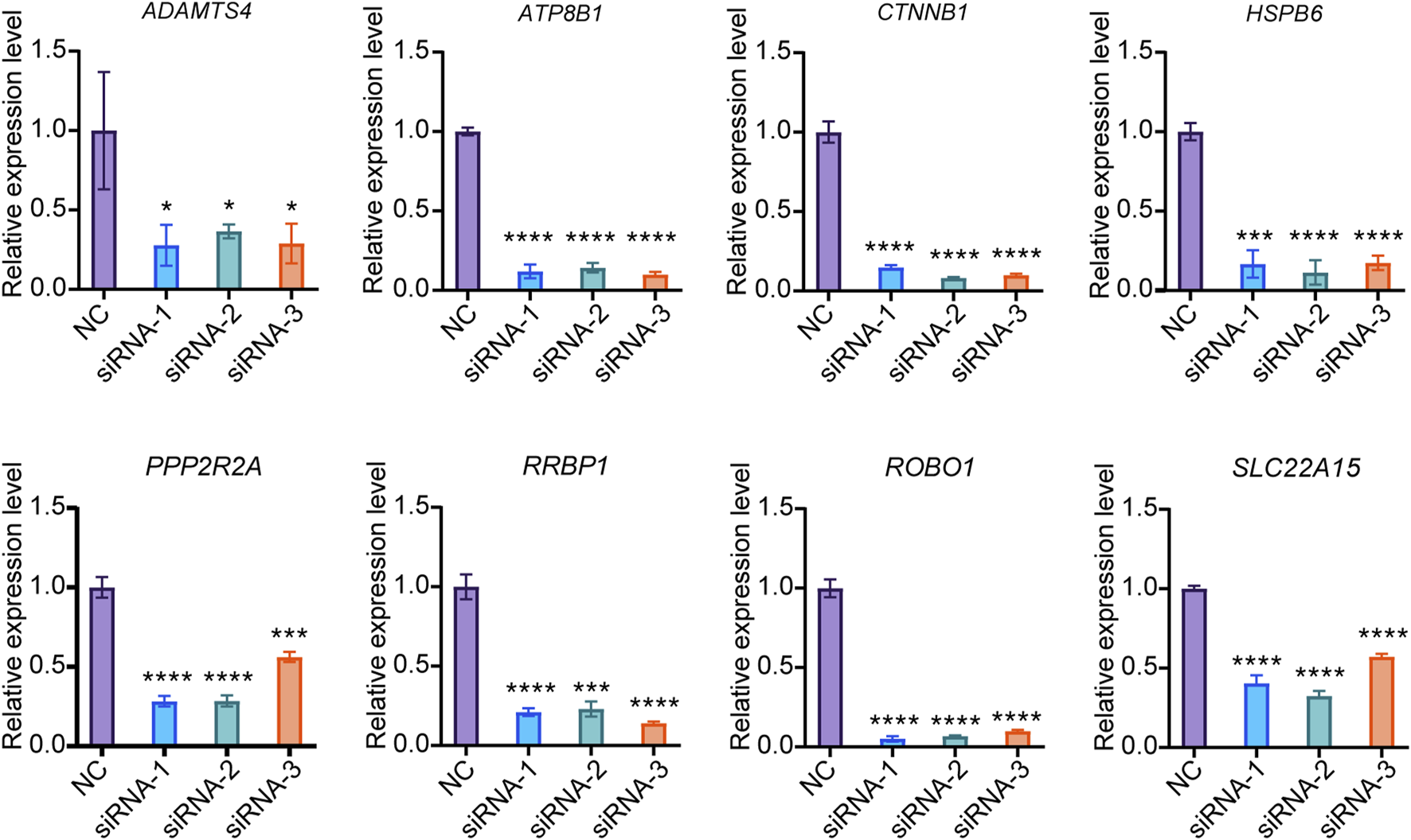 Figure 3. Knockdown efficiency of siRNA. The expression of target genes in Saos-2 cells were detected by qPCR (N = 3). Values represent the mean ± SD. *: P < 0.05, ***: P < 0.001, ****: P < 0.0001.