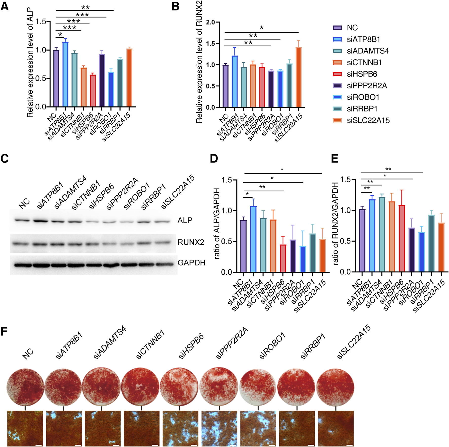 We further examined the expression of ALP and RUNX2 proteins on the 6th day of differentiation. Our results indicate that the knockdown of ATP8B significantly increases the expression of both ALP and RUNX2 proteins. Conversely, the knockdown of PPP2R2A, ROBO1, RRBP1, and SLC22A15 significantly inhibits the expression of ALP and RUNX2 proteins, while HSPB6 alone suppresses the expression of ALP (Figures 4C–E).