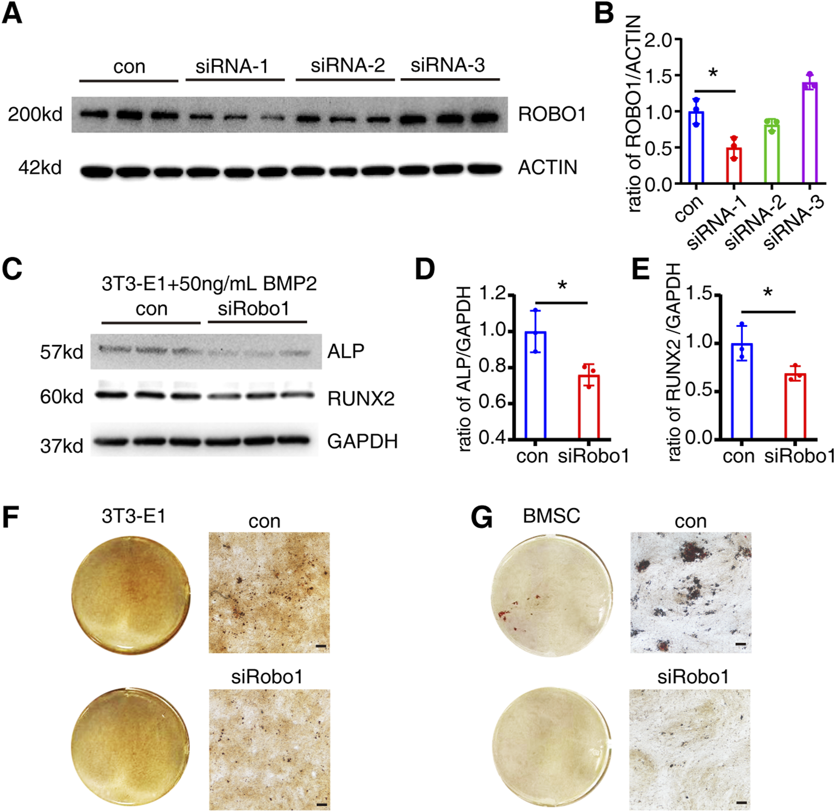 Figure 5. Robo1 knockdown inhibits osteogenic differentiation of 3T3-E1. (A, B) Protein expression and quantification of ROBO1 expression after siRNA transfection 3T3-E1 (N = 3). (C–E) Protein expression and quantification of ALP and RUNX2 in 3T3-E1 on day 6 of differentiation (N = 3). (F) Alizarin red staining of 3T3-E1. (G) Alizarin red staining of BMSC (Scale bar: 100 μm). Values represent the mean ± SD.*: P < 0.05.