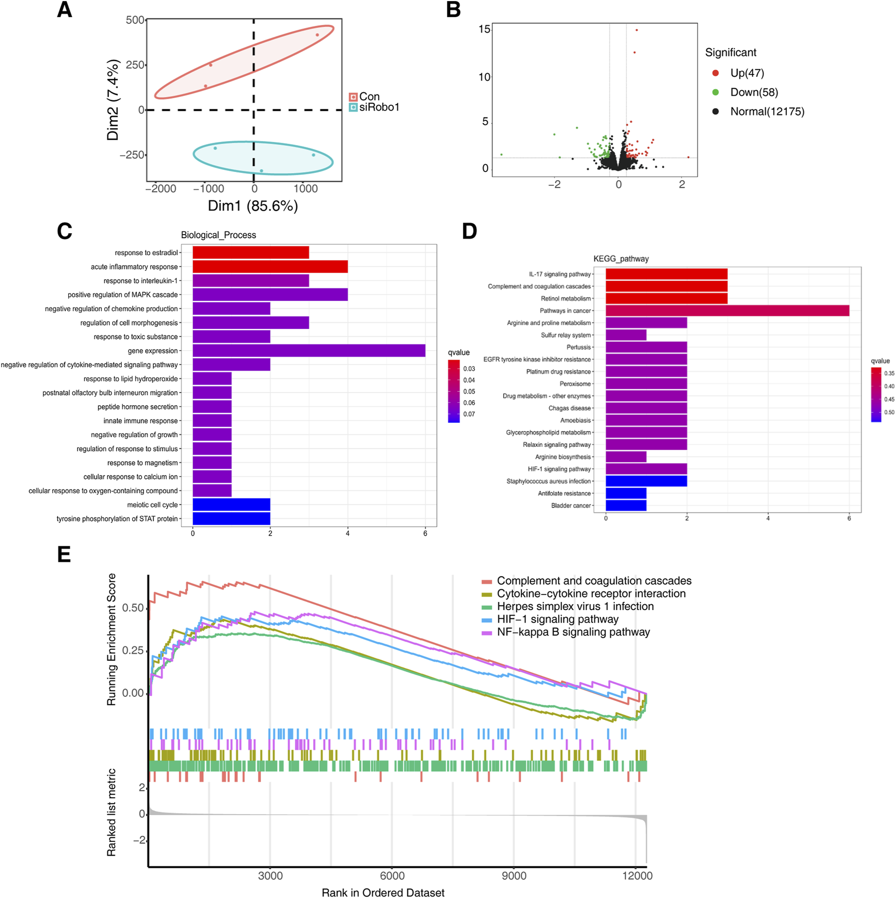 Figure 6. Robo1 regulates inflammatory pathways in 3T3-E1. (A) PCA analysis of control and Robo1 knocked down samples (N = 3). (B) Volcano plot of differentially expressed genes. (C) GO enrichment of differentially expressed genes. (D) KEGG enrichment of differentially expressed genes. (E) GSEA analysis of control and Robo1 knocked down samples.