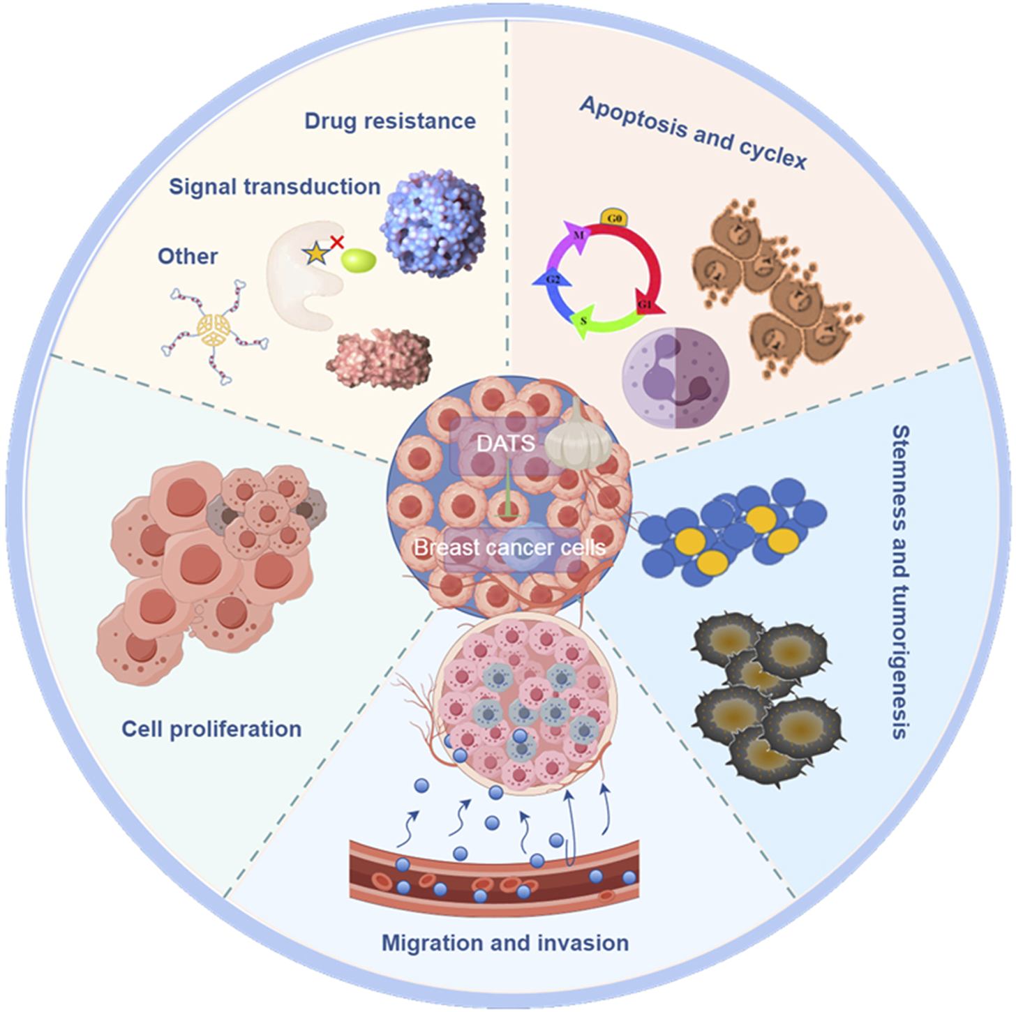 As a natural phytochemical, DATS is expected to become a new prevention and treatment strategy for breast cancer, especially triple negative breast cancer, which has great clinical application prospects. DATS play an intervention and therapeutic role in the proliferation, migration, invasion, drug resistance, cell cycle arrest, apoptosis, stem cell specificity and other aspects of breast cancer.