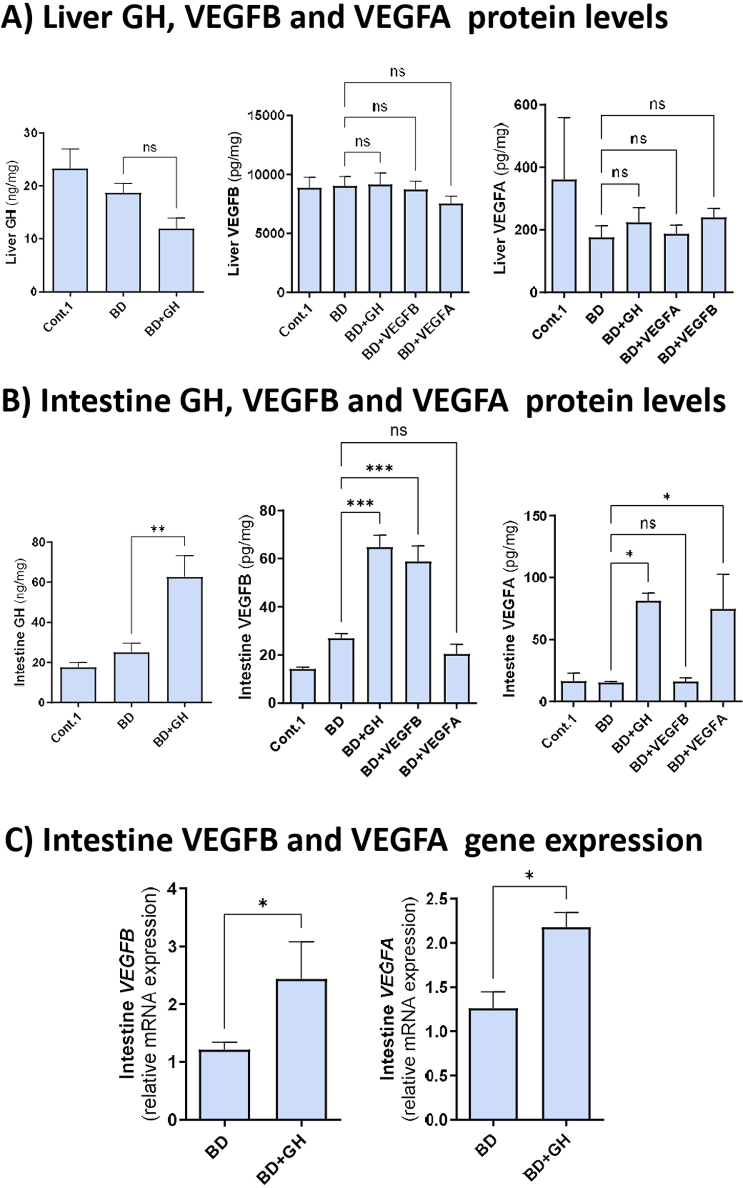 GH-VEGFB/VEGFA pathway in DBDs with ALD. (A) Liver GH, VEGFB and VEGFA protein levels. (B) Intestine GH, VEGFB and VEGFA protein levels. (C) Intestine VEGFB and VEGFA relative mRNA expression. ****p ≤ 0.0001; **p ≤ 0.01; *p ≤ 0.05 and ns = no significance.