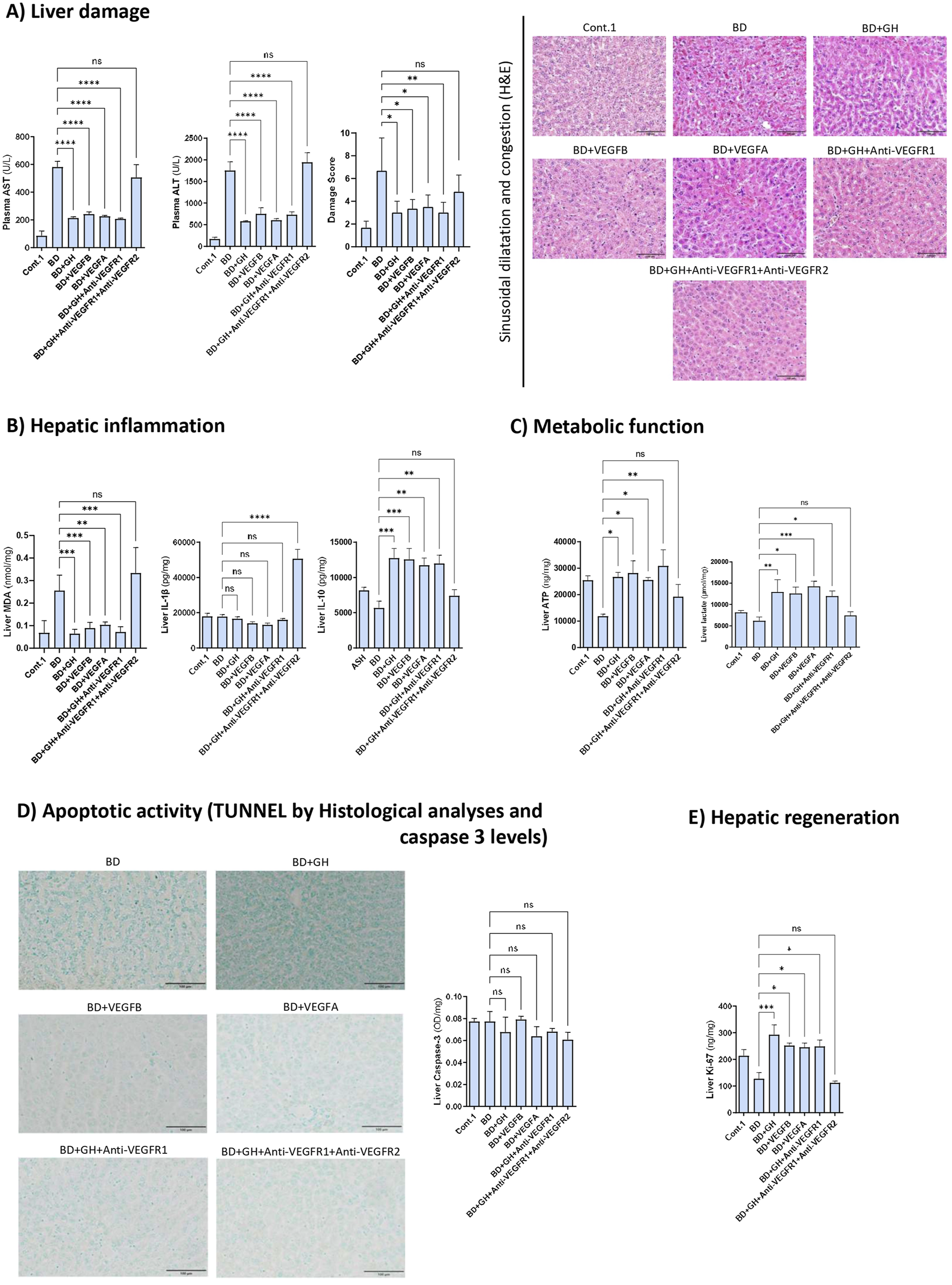 Relevance of GH-VEGFB/VEGFA axis in liver damage, inflammation, metabolic function cell death and regeneration in DBDs with ALD. (A) AST and ALT levels in plasma and liver damage score with representative photomicrographs of sinusoidal dilatation and congestion (20X) (scale bar corresponds to 100 µm). (B) Hepatic levels of MDA, IL-1β and IL-10. (C) Hepatic levels of ATP and lactate. (D) TUNEL stained sections (20X) to detect apoptotic cells (scale bar correspond to 100 µm) and caspase-3 liver levels. (E) Regeneration biomarker Ki-67 liver levels. ****p ≤ 0.0001, ***p ≤ 0.001, **p ≤ 0.01; *p ≤ 0.05 and ns = no significance.