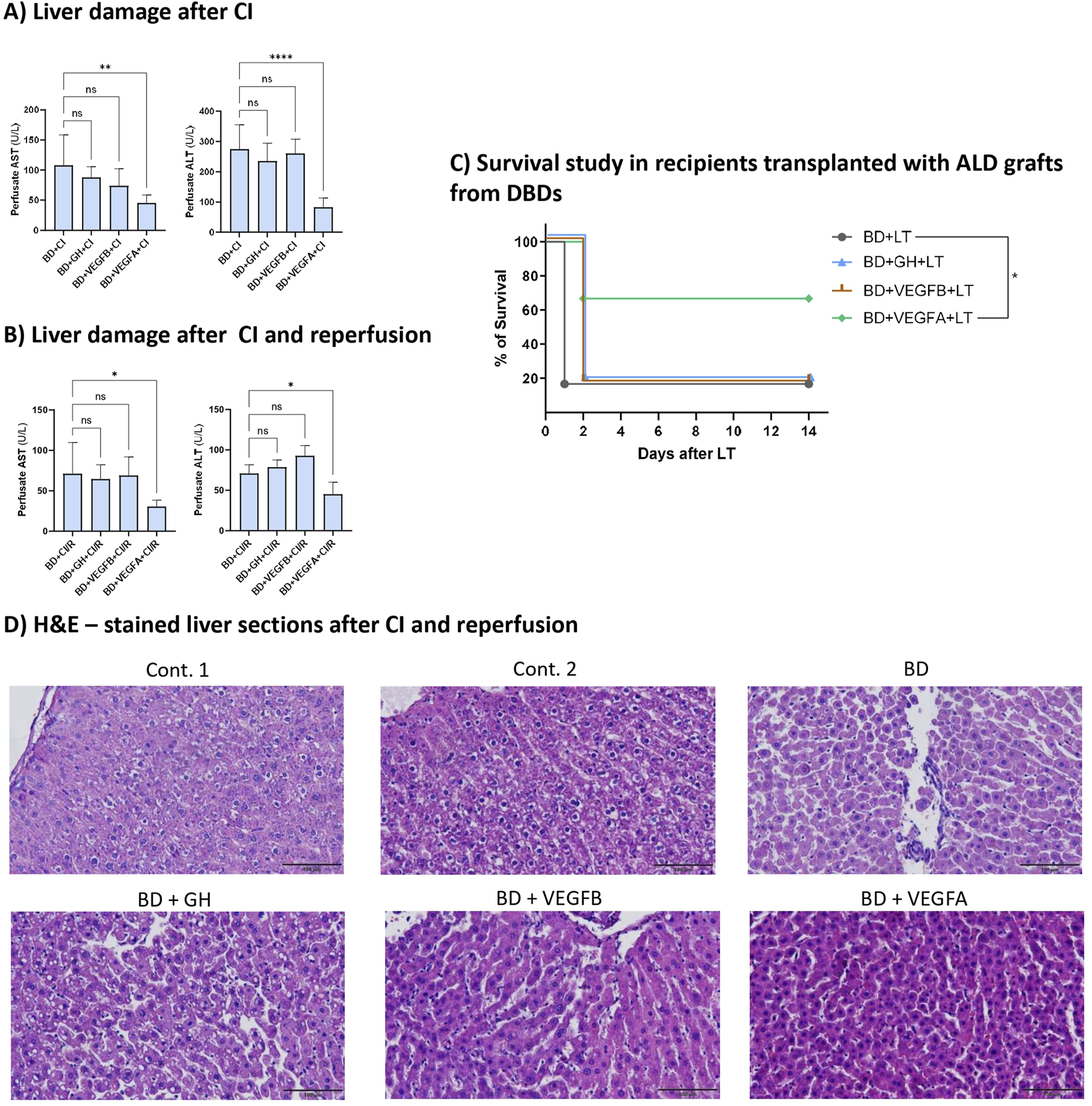 Considering the previously obtained data, we assessed the role of GH, VEGFB, and VEGFA in ALD livers from DBDs after CI and reperfusion in an ex vivo model and survival studies.