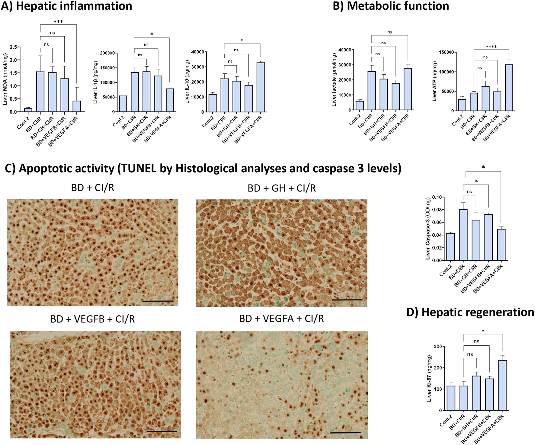 GH-VEGFB/VEGFA pathway importance on inflammatory, metabolic apoptotic and regenerative parameters after I/R injury. (A) Hepatic levels of MDA, IL-1β and IL-10. (B) Hepatic levels of ATP and lactate. (C) TUNEL stained sections (20X) to detect apoptotic cells or bodies (in brown) (scale bar correspond to 100 µm) and caspase-3 liver levels. (D) Regeneration biomarker Ki-67 liver levels. ****p ≤ 0.0001, ***p ≤ 0.001; *p ≤ 0.05 ns = no significance.