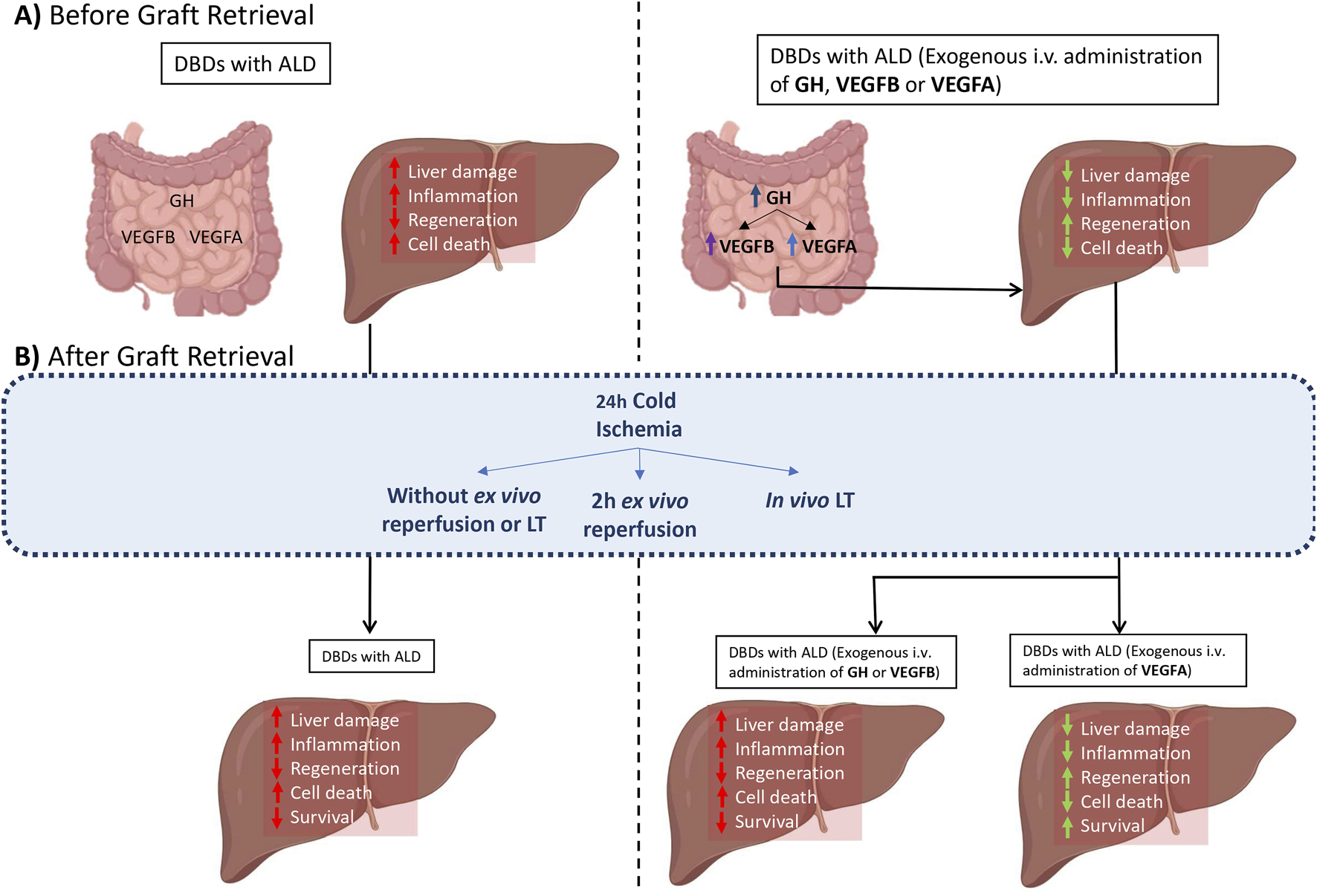Our results indicate insignificant alterations in the hypothalamic-pituitary axis in DBD. Indeed, BD did not induce changes in GH levels in either the liver or intestine. GH is involved in numerous metabolic disturbances and liver pathologies (Fang et al., 2019; Rufinatscha et al., 2018; Sarmento-Cabral et al., 2021; Tateno et al., 2011), and according to our results, the administration of GH, which only reaches the intestine, improves the quality of liver grafts from DBDs with ALD before graft retrieval because it modulates VEGFB and VEGFA expression in the intestine. Treatment with GH, VEGFB, or VEGFA does not affect the liver, but interestingly protects the liver with ALD from BD-induced damage before liver retrieval from donors. However, the benefits observed with GH, VEGA, and VEGFB before liver retrieval from DBDs are different from those observed when liver grafts are retrieved and subjected to ex vivo and in vivo models of LT, as explained below.