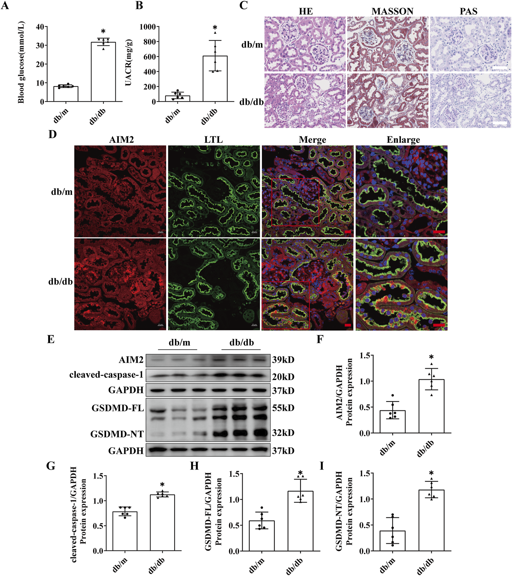 AIM2 is significantly elevated in proximal tubular epithelial cells of db/db mice. (A) Blood glucose in mice (n = 6 mice per group). (B) Mouse urine albumin-to-creatinine ratio (UACR, n = 6 mice per group). (C) Representative pathological images in kidney sections of db/m and db/db mice. Scale bar: white 50 μm. (D) Representative immunofluorescence images of AIM2 (red) and LTL (green) in kidney sections of db/m and db/db mice. scale bar: red 20 μm. (E–I) Representative Western blot images and quantification of AIM2 (n = 6 mice per group), cleaved-caspase1 (n = 6 mice per group), GSDMD-FL (n = 6 mice per group) and GSDMD-NT (n = 6 mice per group) expression in the renal cortex of db/m and db/db mice. Data are shown as Mean ± SD. * vs. db/m, p < 0.05.