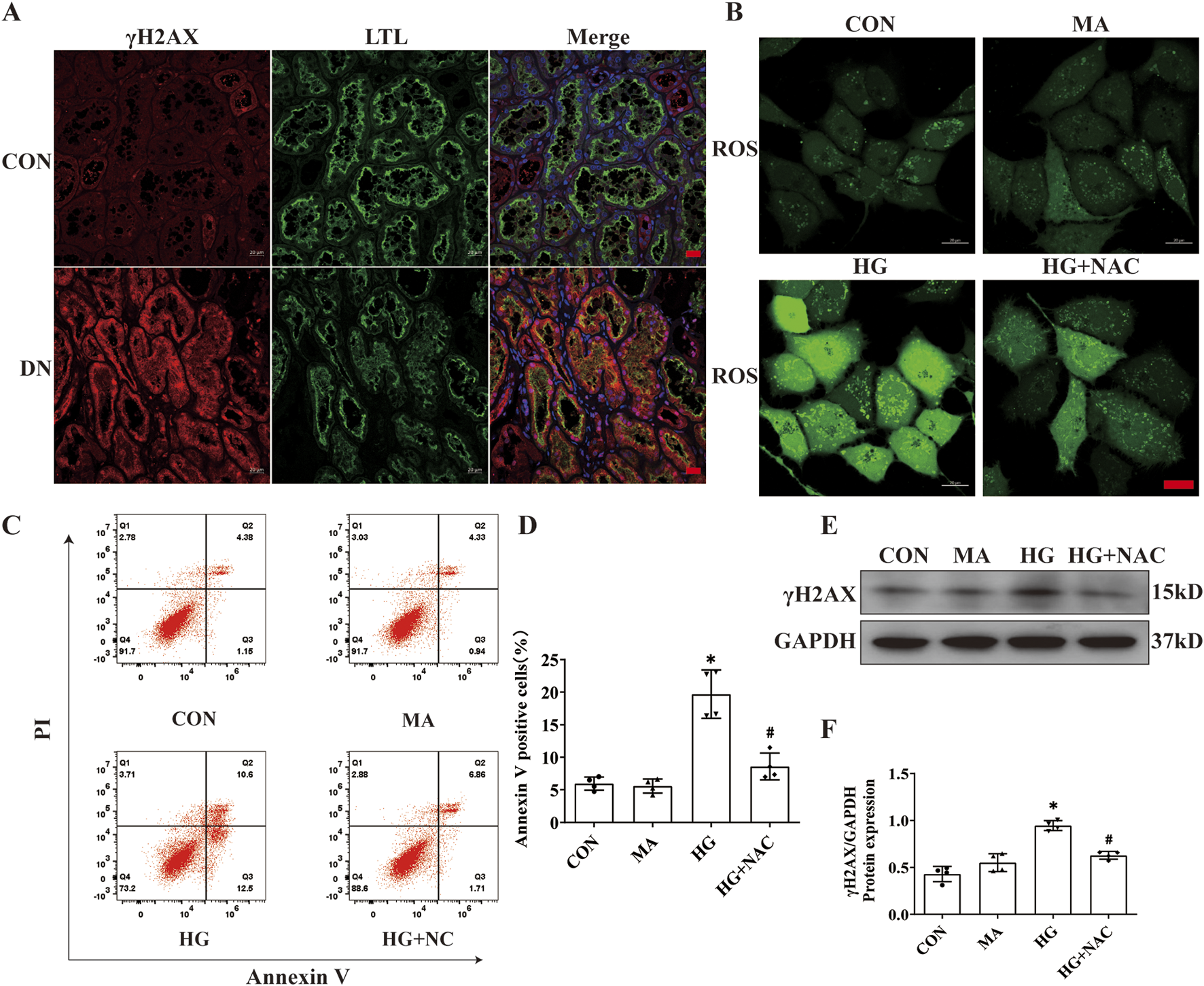 NAC diminishes DNA damage and HK2 cell death. Inhibition of ROS by NAC in HK2 cells with HG intervention. (A) Representative immunofluorescence images of γH2AX (red) and LTL (green) in kidney sections from DN patients and normal kidneys. Scale bar: red 20 μm. (B) Representative cellular immunofluorescence images of ROS in HK2 cells. scale bar: red 20 μm. (C–D) Flow cytometry analysis to assess the regulation of HK2 cell death by NAC (n = 4). (E–F) Representative Western blot images and quantification results of γH2AX (n = 4) expression in HK2 cells. Data are shown as Mean ± SD. * vs. CON, # vs. HG, p < 0.05.