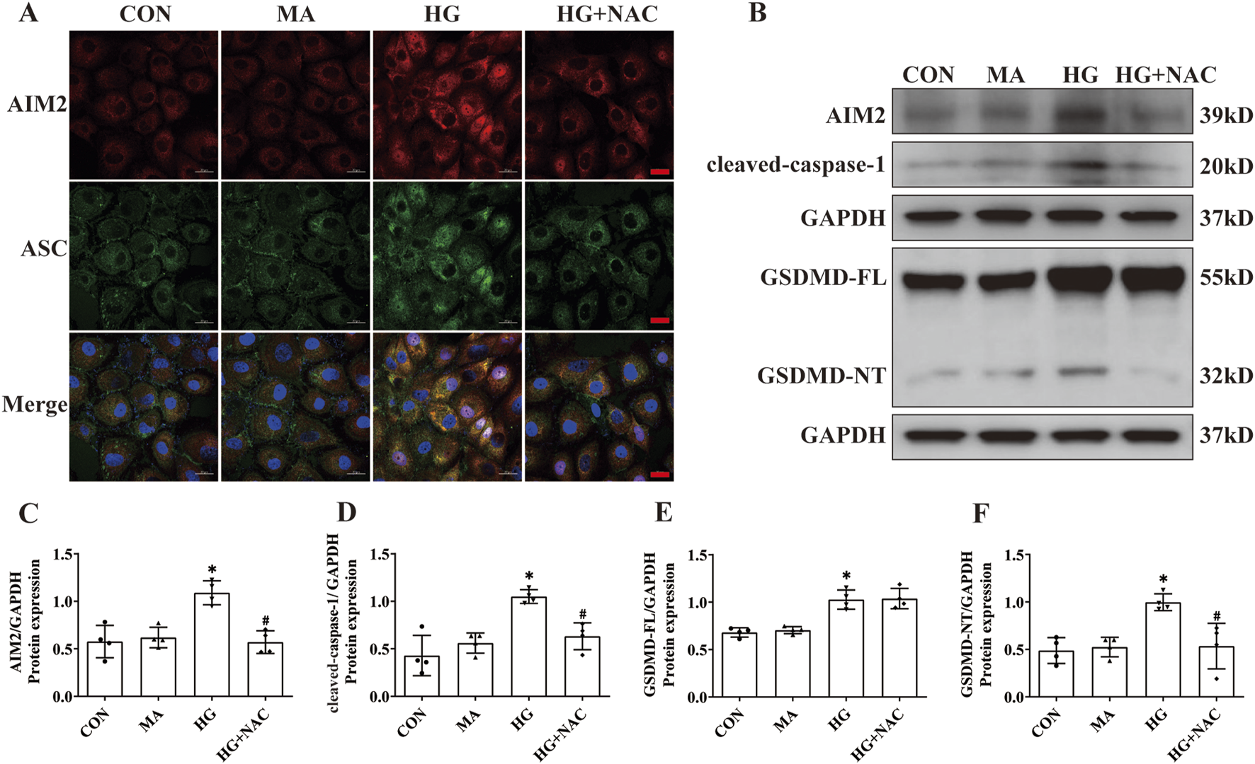 NAC diminishes expression of AIM2 and HG-induced pyroptosis in HK2 cells. (A) Representative cellular immunofluorescence images of AIM2 (red) and ASC (green) in HK2 cells. scale bar: red 20 μm. (B–F) Representative Western blot images and quantification results of AIM2, cleaved-caspase1, GSDMD-FL, GSDMD-NT expression in HK2 cells (n = 4). Data are shown as Mean ± SD. * vs. CON, # vs. HG, p < 0.05.
