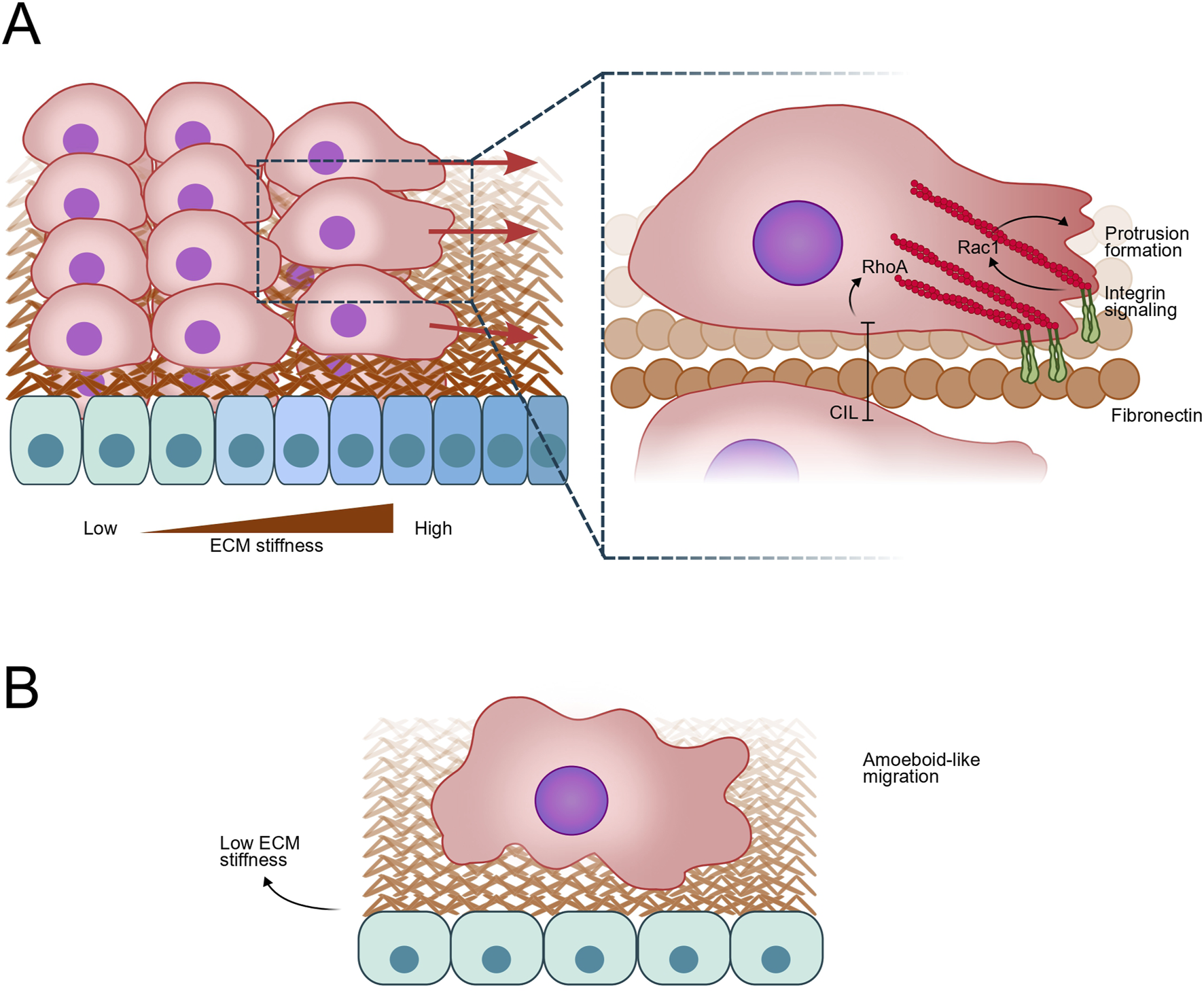 Neural Crest (NC) cell Migration in response to mechanical cues. (A) NC cells exhibiting collective migration in response to durotactic signals, characterized by a gradient of extracellular matrix (ECM) stiffness due to ECM composition, and cell density in the mesodermal tissue. This process involves integrin-mediated signaling and focal adhesion formation, leading to Rac1 activation and subsequently, actin polymerization and protrusion formation at the leading edge, while RhoA activation inhibit protrusion formation via Contact Inhibition of Locomotion (CIL). The mechanical properties of the ECM and mesodermal stiffness play crucial roles in guiding the directional migration of NC cells. (B) At low cell density, NC cells switch to an amoeboid-like migration, characterized by less dependence on focal adhesions and integrin signaling. Instead, this mode relies on the flexibility of the cell cortex and actomyosin contractility, allowing cells to move through the ECM with increased plasticity and adaptability. Amoeboid migration is facilitated by changes in cell shape and rapid, transient protrusions, enabling efficient navigation through variable ECM environments.