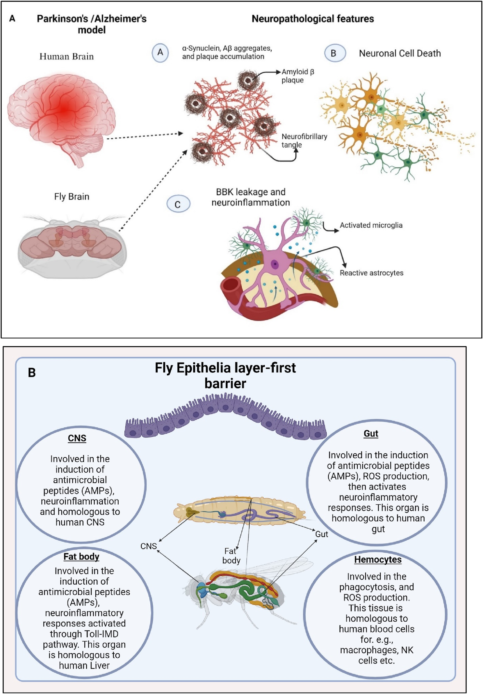 Neuronal cell death and enhanced production of antimicrobial peptides (AMPs) triggers neuroinflammation in D. melanogaster (A). Misfolding of α-Synuclein and Aβ proteins causes neurotoxicity which further activates the immune responses via activation of microglial cells causing BBB (Blood Brain Barrier) leakage and neuroinflammation. (B). The organs of the fly, which are crucial in activating molecules and signaling in the innate immune response, have striking functional similarities with those of mammals. The fly’s CNS, gut, trachea, fat body, Malpighian tubules, and hemocytes mimic their human counterparts and actively participate in triggering immune pathways, inducing the production of antimicrobial peptides (AMPs) and reactive oxygen species (ROS), melanization, cytokine production, and phagocytosis. Generated by BioRender.