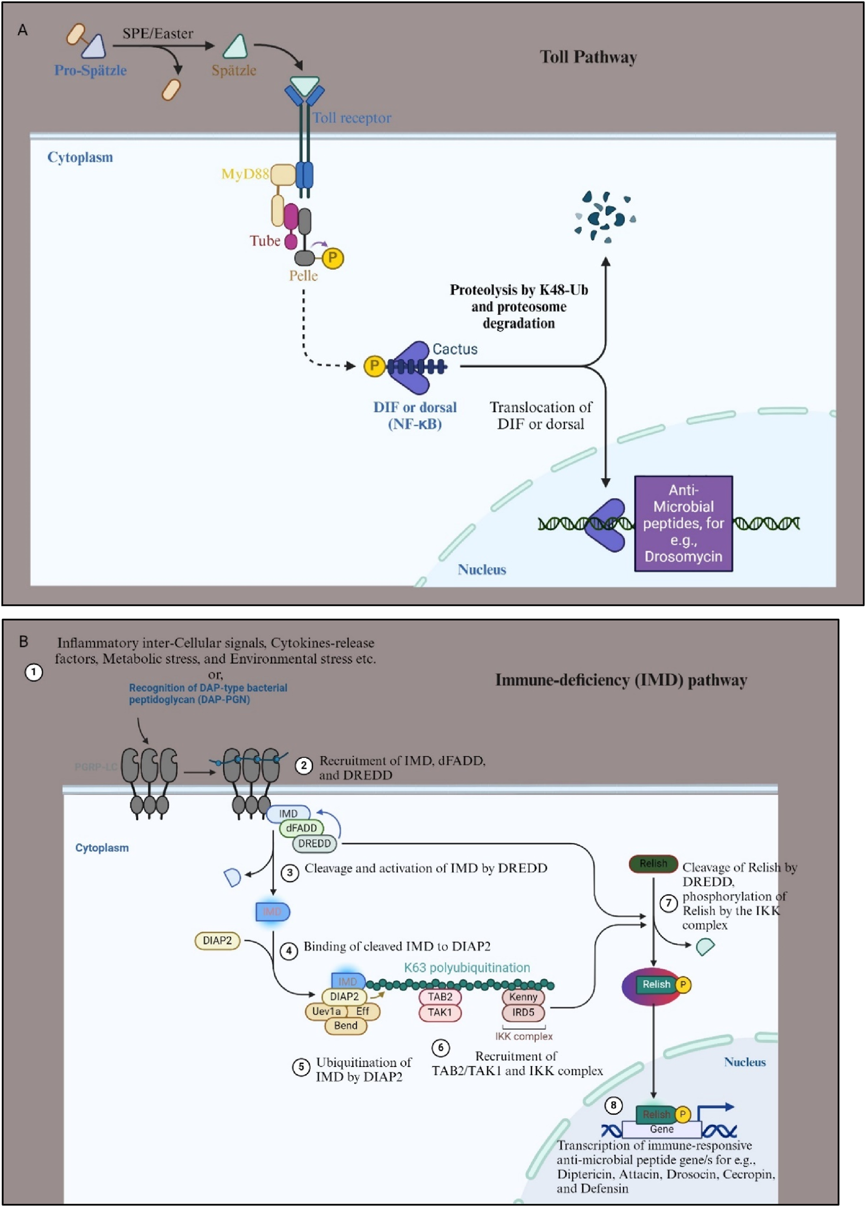 Toll and IMD signaling pathway of D. melanogaster.(A) The Toll pathway in Drosophila melanogaster is a critical component of the innate immune response, primarily activated by fungal and bacterial infections. It begins with the recognition of pathogens by pattern recognition receptors (PRRs), which detect microbial patterns. This leads to proteolytic activation of the cytokine-like molecule Spätzle. Activated Spätzle binds to the Toll receptor, which recruits adaptor proteins such as MyD88, Tube, and Pelle, initiating a phosphorylation cascade that results in the degradation of the Cactus (IkB homolog) protein. This degradation releases the transcription factors Dl and DIF, allowing them to translocate into the nucleus. Once in the nucleus, Dl and DIF induce the expression of AMPs like Drosomycin and other immune response genes, helping the organism to combat the infection. (B) The IMD pathway is primarily activated by aggregated proteins or Gram-negative bacterial infections. This pathway is initiated by the binding of bacterial peptidoglycans to the pattern recognition receptor PGRP-LC (step 1). Upon recognition, PGRP-LC activates the IMD protein, which recruits the adaptor protein death domain-containing protein (dFADD) and the caspase “death related ced-3/Nedd 2- like” (Dredd) (step 2). This leads to the activation of the Transforming growth factor-β (TGF-β)-activated kinase 1 (TAK1) complex, which subsequently activates the inhibitor of nuclear factor kappaB-kinase (IKK) complex (step 4, 5, and 6). The IKK complex phosphorylates the NF-κB-like transcription factor Relish, causing its cleavage (step 7). The cleaved Relish translocates to the nucleus, where it activates the transcription of AMPs for e.g., Attacin, Cecropin, Drosocin etc., and other immune response genes (step 8). Both pathways are essential for the Drosophila melanogaster immune defense, each tailored to respond to different types of pathogens. For more details see Kleino and Silverman, 2014. Figure drawn with Biorender.