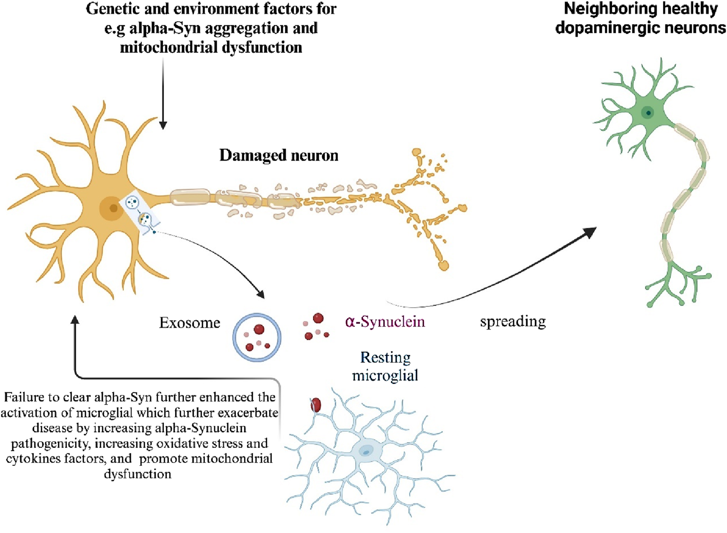 Mechanisms of α-Synuclein induced neurotoxicity in Parkinson’s Disease Genetic and environmental factors contribute to the aggregation of α-Synuclein, leading to its accumulation in neurons. Excessive α-Synuclein is transported into mitochondria, causing mitochondrial dysfunction, a key factor in PD progression. Mutations in mitochondrial-associated proteins such as LRRK2, PINK1, PARK7, and PRKN, found in familial PD cases, also induce mitochondrial dysfunction and neurotoxicity. When α-Synuclein aggregation exceeds cellular clearance capacity, it is released either directly from neurons or through exosomes, activating microglia and spreading α-Synuclein to neighboring healthy dopaminergic (DA) neurons, thus amplifying neurotoxicity. Damage-associated molecular patterns (DAMPs) released from dying neurons further enhance microglial activation. Additionally, genetic and environmental factors promote the activation of microglia and other immune cells. Activated microglia exacerbate the disease by increasing α-Synuclein pathogenicity, oxidative stress, and mitochondrial dysfunction. Generated by BioRender.