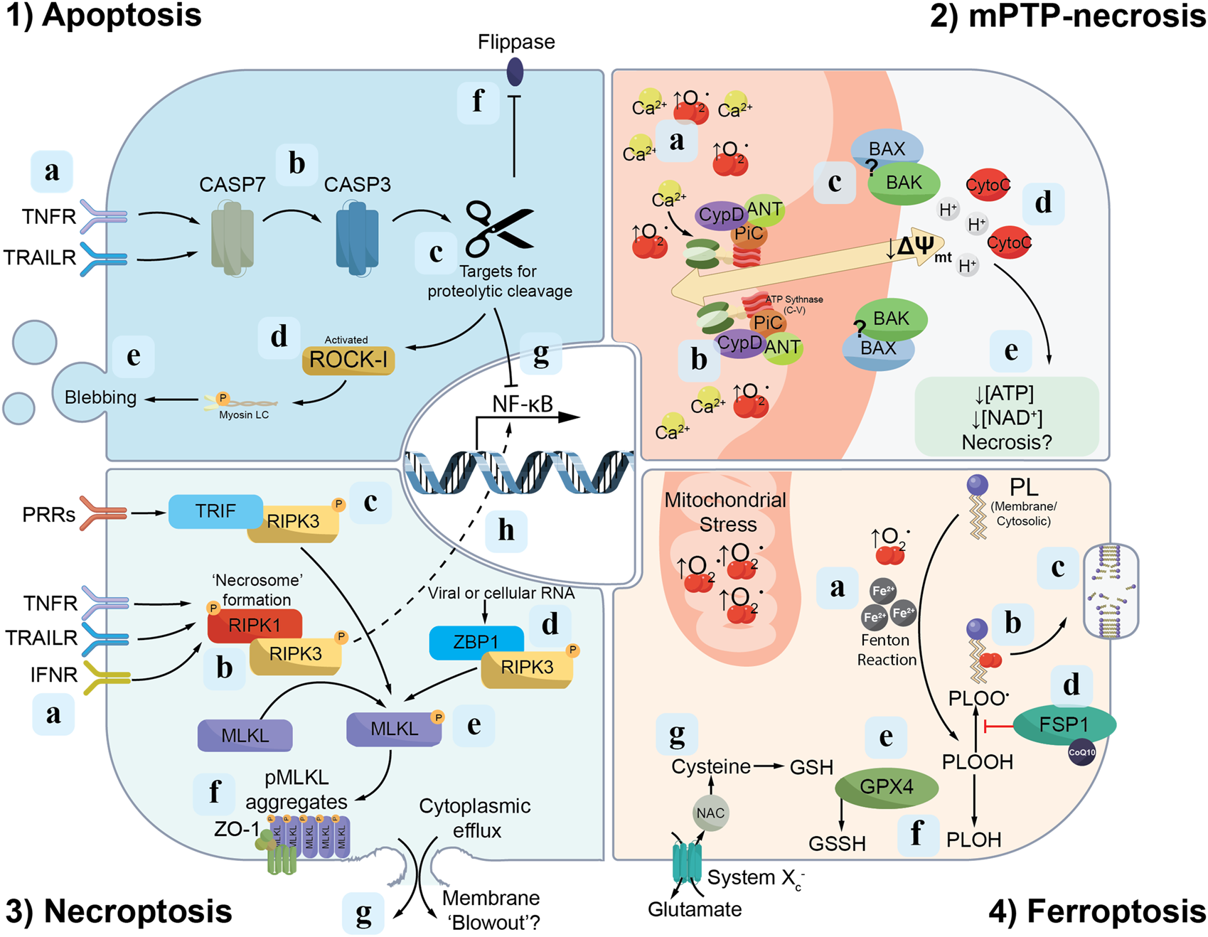 Signalling cascades of discrete modes of RCD. Apoptosis: (1a) The extrinsic apoptosis pathway is initiated following activation of death ligands [e.g., tumour necrosis factor receptor (TNFR) or TNF-related apoptosis-inducing ligand receptors (TRAILR)] by their respective ligands, which in turn triggers (1b) proteolytic cleavage of cysteine proteases, named caspases, culminating in the maturation of caspase-7 (CASP7) and caspase-3 (CASP3). (1c) Active caspase-3 proteolytically cleaves a range of targets, including (1d) ROCK1 which triggers membrane “blebbing” (1e) and apoptotic cell death. (1f) Additionally, active caspase-3 mediates the cleavage of “flippases”, thus permitting phosphatidylserine presentation on the cell membrane outer leaf. (1g) Active caspase-3 also interferes with anti-apoptotic signalling through cleavage of the p65 subunit of nuclear factor-κB (NF-κB). Mitochondrial permeability transition pore (mPTP)-necrosis: (2a) An accumulation of mitochondrial reactive oxygen species (ROS; e.g., ↑O2·) and calcium (Ca2+) trigger the opening of the mPTP. (2b) The F1F0 subunit of ATP synthase forms part of the inner mitochondrial membrane pore as a component of a “synthasome” complex, consisting of PPIF/cyclophilin D (CypD), ANT and PiC. (2c) The BAX and BAK proteins which accumulate in regions surrounding the mPTP are hypothesised to form part of the outer pore on the cytosolic leaf of the mitochondrial membrane. (2d) Once formed, the mPTP facilitates the release of protons (H+) and cytochrome c (CytoC) from the mitochondrial matrix into the cell. Proton release depolarizes the mitochondrial membrane (↓∆Ψmt), preventing further ATP and NAD+ biosynthesis. (2e) The combination of these leads to failed homeostasis and necrotic cell death. Necroptosis: (3a) Activation of TNFR, TRAILR and/or type I interferon receptors (IFNR) mediate the phosphorylation of RIPK-1 and -3, which in turn accumulate into structures called “necrosomes” (3b). (3c-d) Alternative pathways of RIPK3 activation are also identified, including binding to TRIF in response to pattern recognition receptor (PRR) engagement and Z-DNA-binding protein 1 (ZBP1) activated by viral or cellular RNA. (3e) Phosphorylated-RIPK3, in turn, mediates the phosphorylation of MLKL (pMLKL). (3f) pMLKL accumulates on the inner leaf of the cell membrane near Zonula Occludens-1 (ZO-1). (3g) These “hotspots” of pMLKL are hypothesised to overcome a physical membranolytic threshold, which causes membrane blow-out and the lytic release of the cytosol to the extracellular space. (3h) Phosphorylated RIPK3 also interacts with NF-κB signalling components to drive pro-inflammatory cytokine release. Ferroptosis: (4a) The accumulation of free iron (Fe2+) and ROS (e.g., from the mitochondria) drives the oxidation of phospholipids and the formation of phospholipid peroxyl radicals (PLOO·) (4b). These lipid peroxyl radicals propagate the oxidation of additional phospholipids, which, if not terminated or repaired, will ultimately cause the loss of cell membrane integrity (4c). Repair of oxidised phospholipids may occur via two pathways: the first (4d) involves ferroptosis suppressor protein 1 (FSP1) converting phospholipid peroxyl radicals (PLOO·) to phospholipid hydroperoxides (PLOOH). (4e) The second pathway of lipid repair involves glutathione peroxidase 4 (GPX4) reducing in a glutathione (GSH)-dependent reaction phospholipid hydroperoxides (PLOOH) to phospholipid alcohols (PLOH) (4f). (4g) System Xc− consists of a heavy chain component, 4F2hc (SLC3A2) and a transport module, xCT (SLC7A11), and functions as a dedicated cysteine import system, which is an important precursor of glutathione.