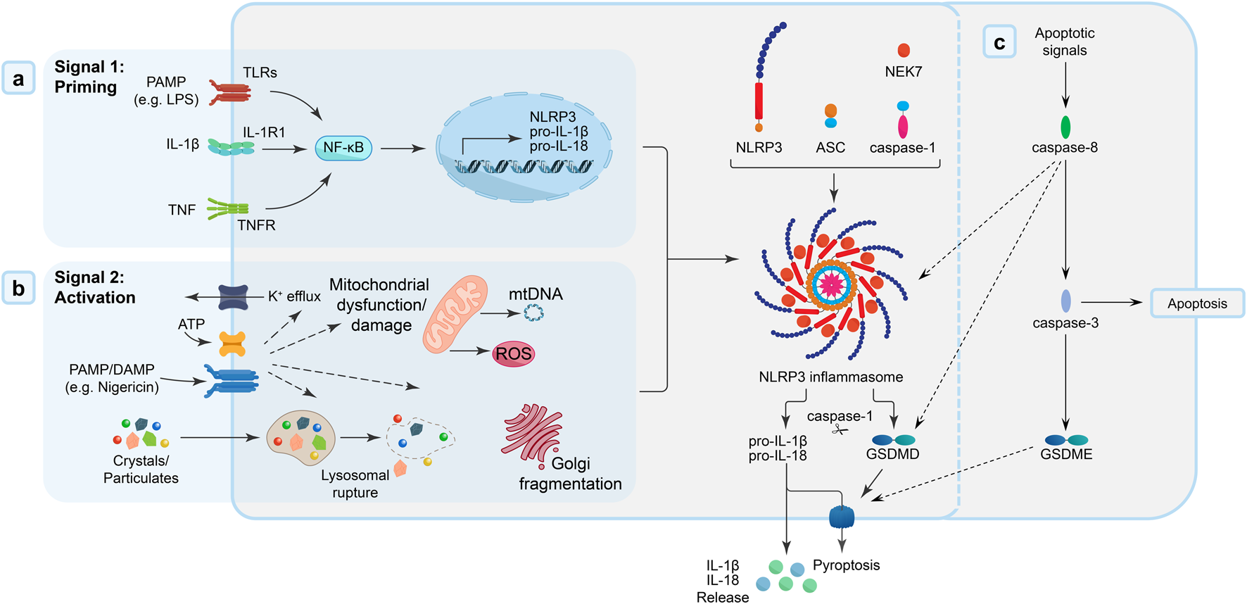 In contrast to these previously defined forms of RCD, pyroptosis is strongly associated with the innate immune system - e.g., neutrophils, monocytes/macrophages, DCs (Liu et al., 2023). Pyroptosis is triggered in response to pathogens (i.e., pathogen-associated molecular patterns; PAMPs) and/or tissue damage (i.e., DAMPs), which drive the formation of multi-protein signalling platforms termed “inflammasomes” and result in caspase-1 activation (Monteleone et al., 2018; Broz and Dixit, 2016; Anders, 2016). Active caspase-1 cleaves pro-inflammatory cytokines, IL-1β and IL-18, and pore-forming protein, gasdermin D (GSDMD), into their mature forms (Boucher et al., 2018; Vijayaraj et al., 2021; Liu et al., 2020; Xia et al., 2021). Cleaved GSDMD accumulates on the inner leaf of the cell membrane where it self-oligomerizes into a size and charge exclusive pore, resulting in plasma membrane rupture, cell lysis and the release of the mature IL-1β/IL-18 (Xia et al., 2021; Liu et al., 2016). Further highlighting the complex molecular links between apoptosis and other discrete forms of regulated necrosis, caspase-8 activation can also trigger pyroptosis either directly via its recruitment into the inflammasome complex or through its cleavage of GSDMD or indirectly by activating caspase-3 to cleave gasdermin E (GSDME) (Pang and Vince, 2023). The NLRP3 (NACHT, leucine-rich-repeat (LRR), and pyrin domain (PYD)-containing protein 3) inflammasome is the most extensively characterised of the inflammasome family {reviewed by [(Swanson et al., 2019), (Broz and Dixit, 2016)]}. Canonical NLRP3 inflammasome activation by danger signals (PAMPs and/or DAMPs) involves both priming and activation steps (summarized in Figure 2). NLRP3 inflammasome activation is implicated in an array of inflammatory pathobiologies {reviewed in [(Coll et al., 2022), (Hutton et al., 2016)]}, including Alzheimer’s disease (Saresella et al., 2016; Heneka et al., 2013; Venegas et al., 2017), cryopyrin-associated periodic syndrome (Leslie et al., 2006; Lachmann et al., 2009), type 2 diabetes (Masters et al., 2010; Lei et al., 2019), and both acute and chronic kidney diseases (Lei et al., 2019; Vilaysane et al., 2010; Ludwig-Portugall et al., 2016).