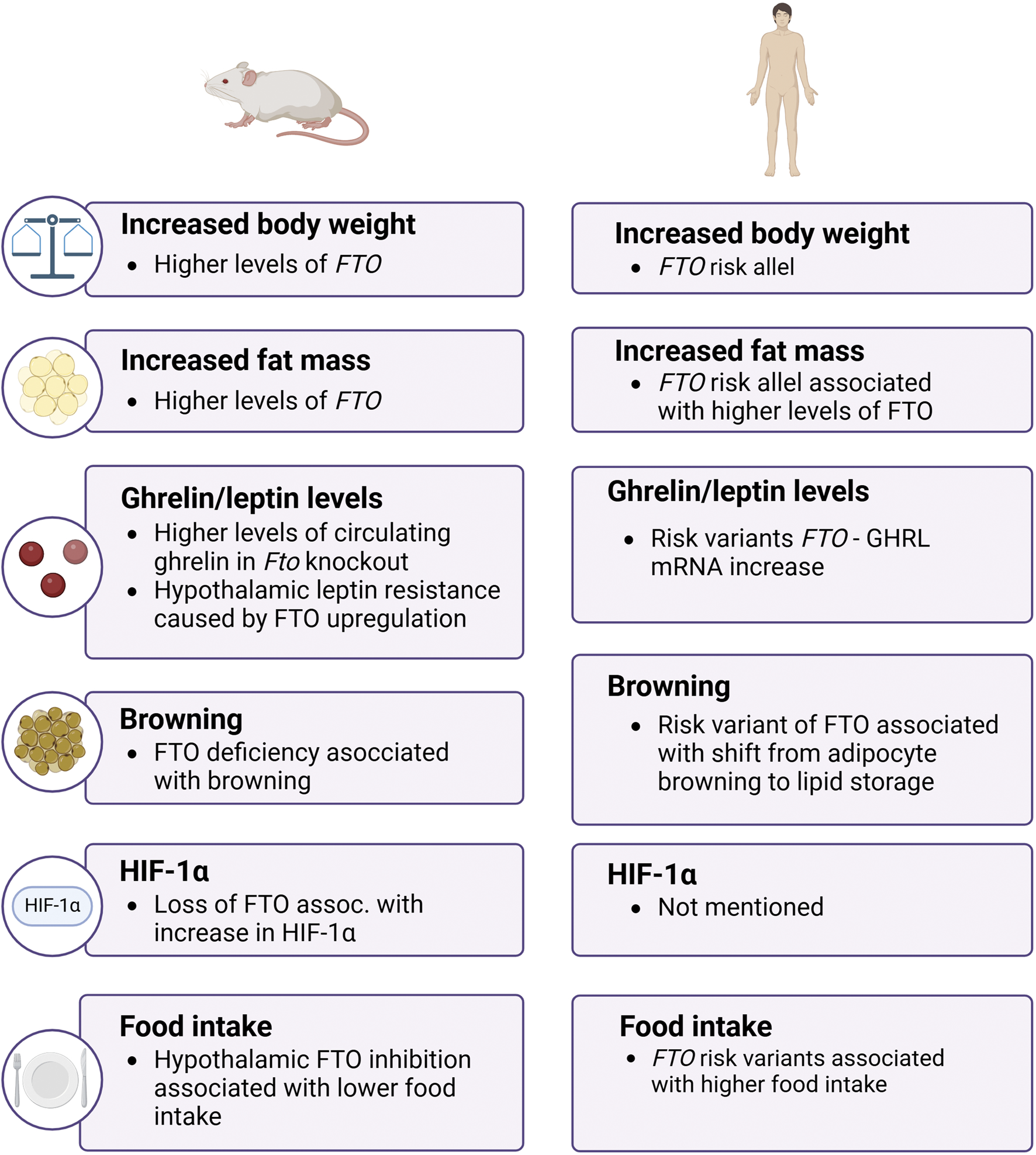 The relationship between FTO and various diseases is complex. In obesity, FTO is associated with increased food intake and reduced satiety, contributing to higher BMI. It also plays a significant role in adipogenesis and the regulation of thermogenesis, further emphasizing its importance in metabolic disorders.