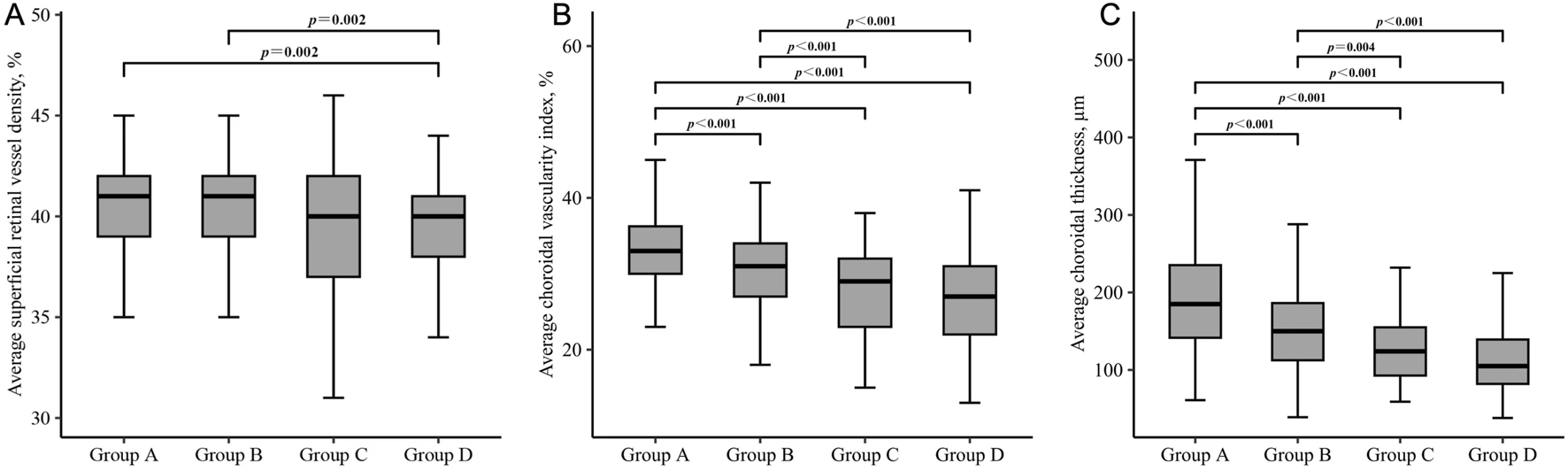 Figure 2. Box plots showing the comparison of superficial retinal vessel density (A), choroidal vascularity index (B) and choroidal thickness (C) in each group. Group A = without beta or gamma zone; Group B = isolated beta zone; Group C = isolated gamma zone; Group D = with both beta and gamma zone. Significance was set at P < 0.00833 for multiple testing in Bonferroni correction.
