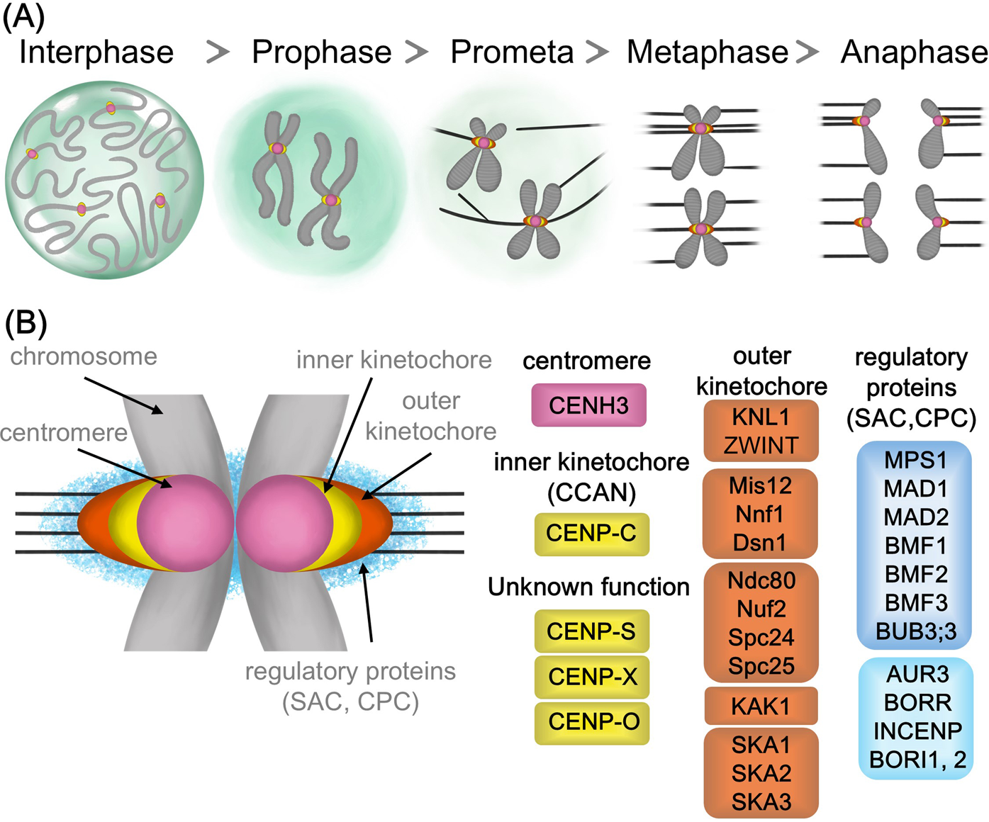 Figure 1. Cell division and kinetochore proteins in plant cells (A) Schematic of cell division stages and chromosome attachment to spindle microtubules by kinetochore (B) A color-coded model of kinetochore organization, showing centromere, inner kinetochore, outer kinetochore and regulatory proteins.