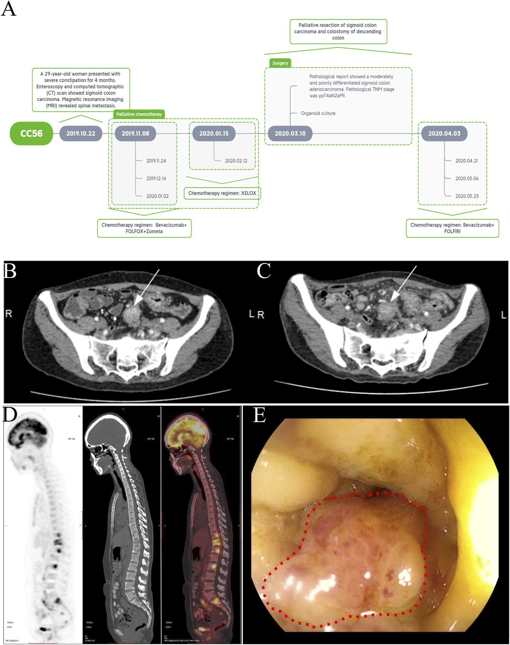 Treatment timeline and clinical characteristics of a case of primary advanced sigmoid colon cancer with bone metastasis. (A) Treatment timeline B-C. Abdominal computed tomography showing sigmoid colon carcinoma before (B) and after treatment (C) (white arrow). (D) PET-CT showing the multiple spinal metastases. (E) Enteroscopic image of stenosis caused by sigmoid colon carcinoma (red dotted circle).