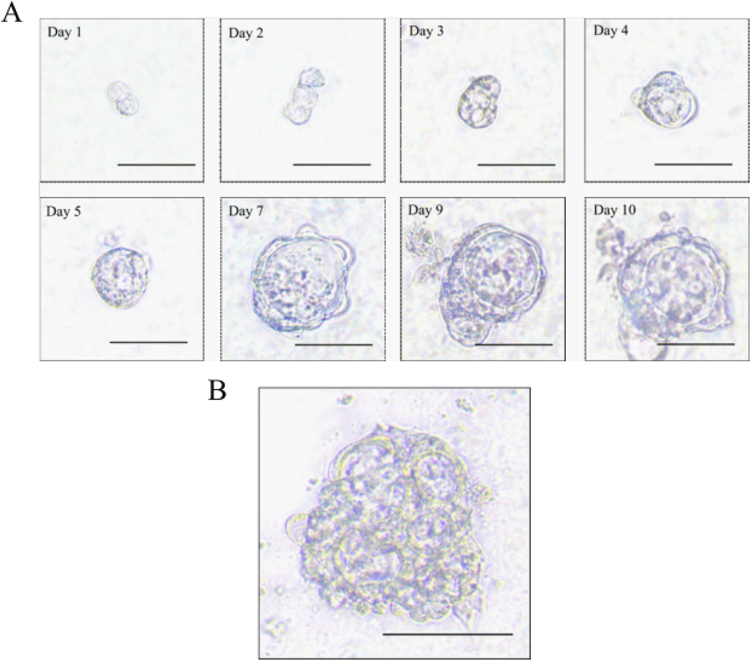 Morphology of the sigmoid colon carcinoma organoid. (A) Time course of the sigmoid colon carcinoma organoid culture (scale bar, 50 μm). (B) Multiple lumen structure of the sigmoid colon carcinoma organoid (scale bar, 50 μm).