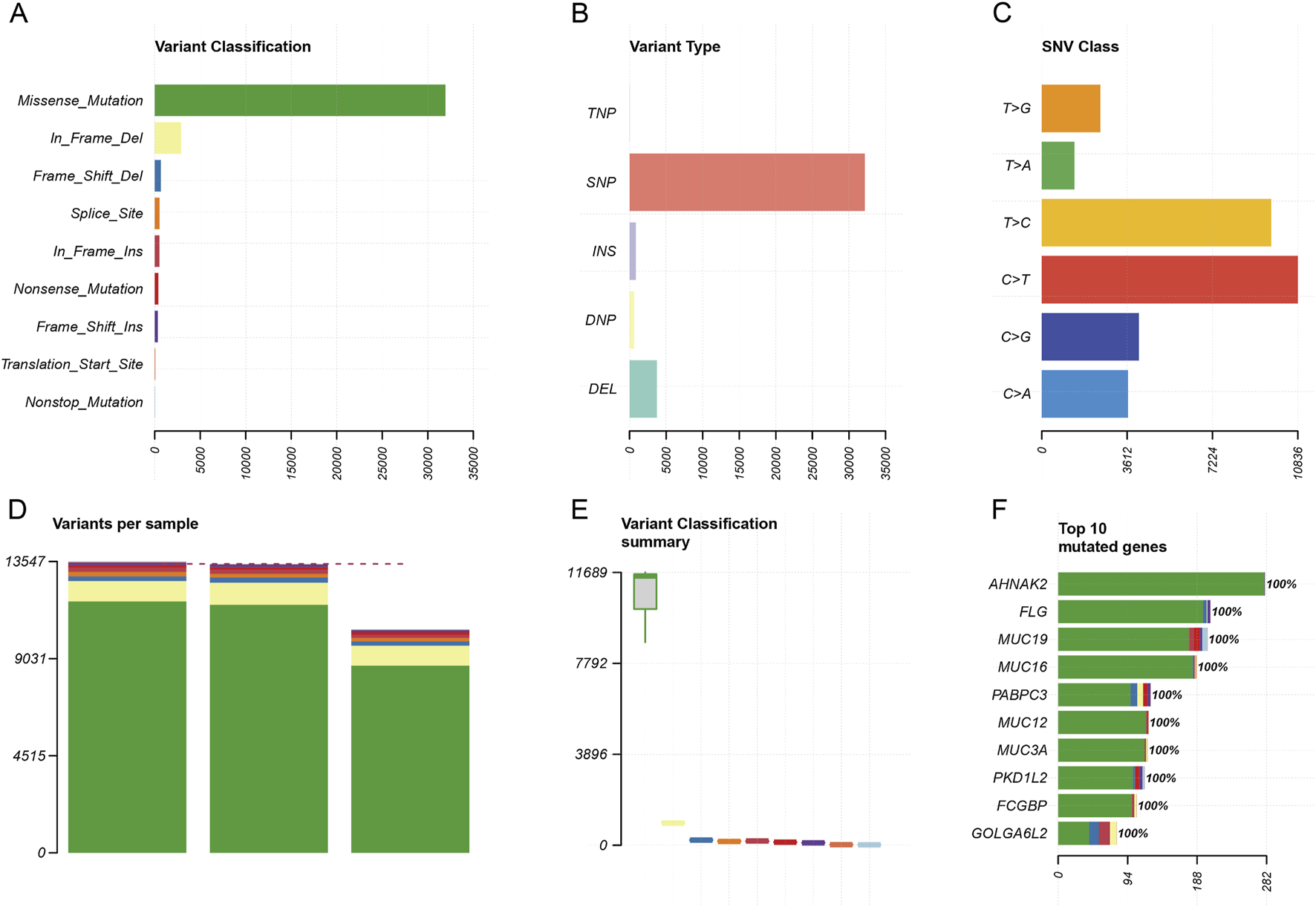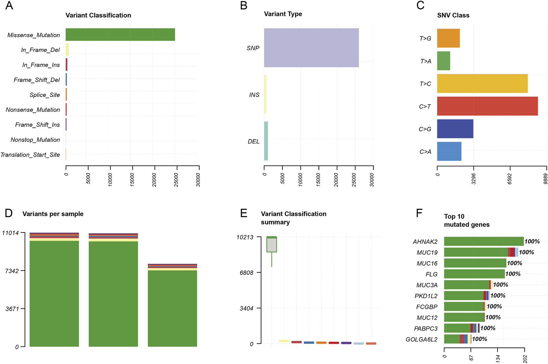 Similarly, we also analyzed the germline mutation of categorization, type, model of the point mutation, and quantity. The result showed that the top of the germline mutation categorized was a missense mutation (Figure 6A). The main variant type was SNP (Figure 6B). The top three SNV classes were C > T, T > C, and C > G (Figure 6C). The number of variants per sample from high to low was in the blood, tissue, and organoid (Figure 6D). The variant classification summary is shown in Figure 6E. The top 10 mutated genes are AHNAK2, MUC19, MUC16, FLG, MUC3A, PKD1L2, FCGBP, MUC12, PABPC3, and GOLGA6L2 (Figure 6F).