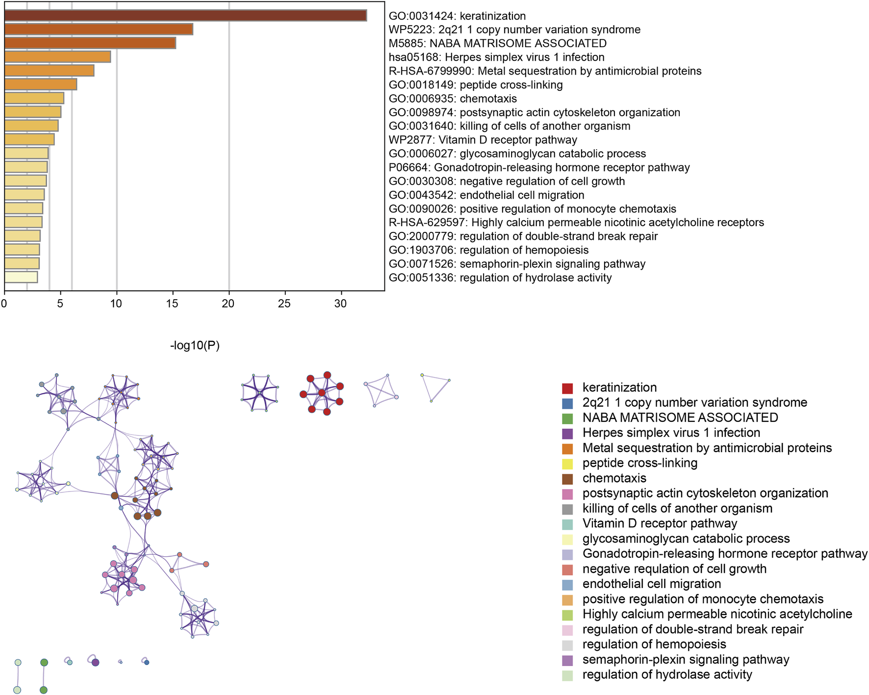 Next, the CNV-related genes were used to perform pathway enrichment analysis in the Metascape database. The result showed enrichment pathways including keratinization, 2q21.1 copy number variation syndrome, NABA matrisome-associated herpes simplex virus infection, metal sequestration by antimicrobial proteins, peptide cross-linking, chemotaxis, postsynaptic actin cytoskeleton organization, killing of cells of another organism, and vitamin D receptor pathway (Figure 8).