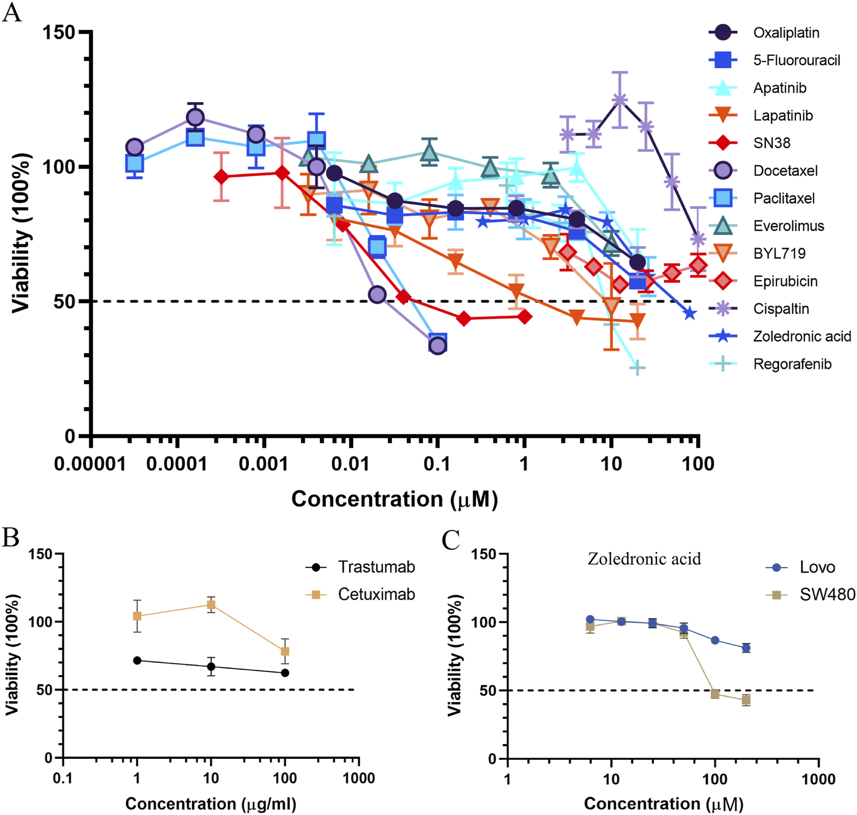 Curves of the organoid treated with chemotherapeutic drugs, targeted medicines (A), and monoclonal antibodies (B). Dose–response curves of colon cancer cell lines to zoledronic acid (C).