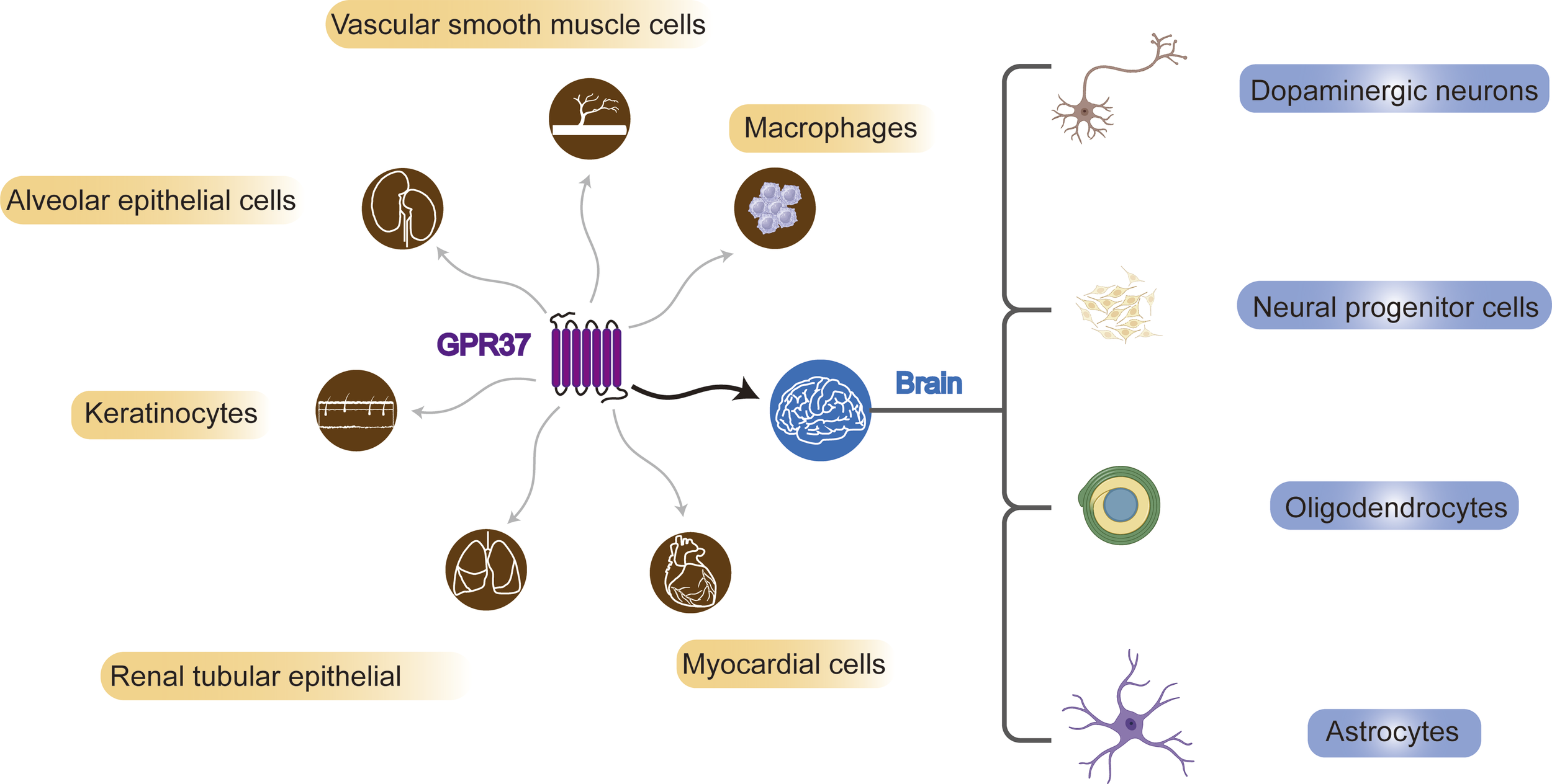 Systemic and brain distribution of GPR37. GPR37 is expressed in various cell types, including vascular smooth muscle cells, macrophages, alveolar and renal tubular epithelial cells, keratinocytes, and myocardial cells. In the brain, it is found in dopaminergic neurons, neural progenitors, oligodendrocytes, and astrocytes.