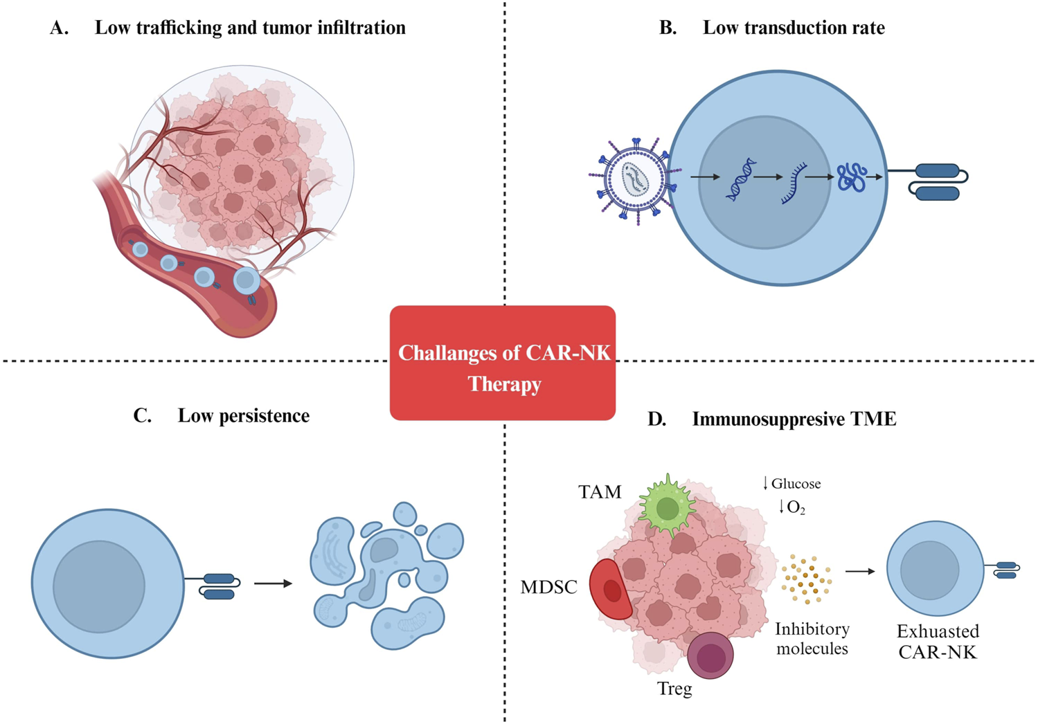 Challenges of CAR-NK cell therapy. (A) Low trafficking and tumor infiltration. (B) Low transduction rate. (C) Low persistence. (D) Immunosuppresive TME. MDSC: Myeloid-derived suppressor cells; TAM: Tumor-associated macrophages; Treg: Regulatory T cells; TME: Tumor microenvironment.