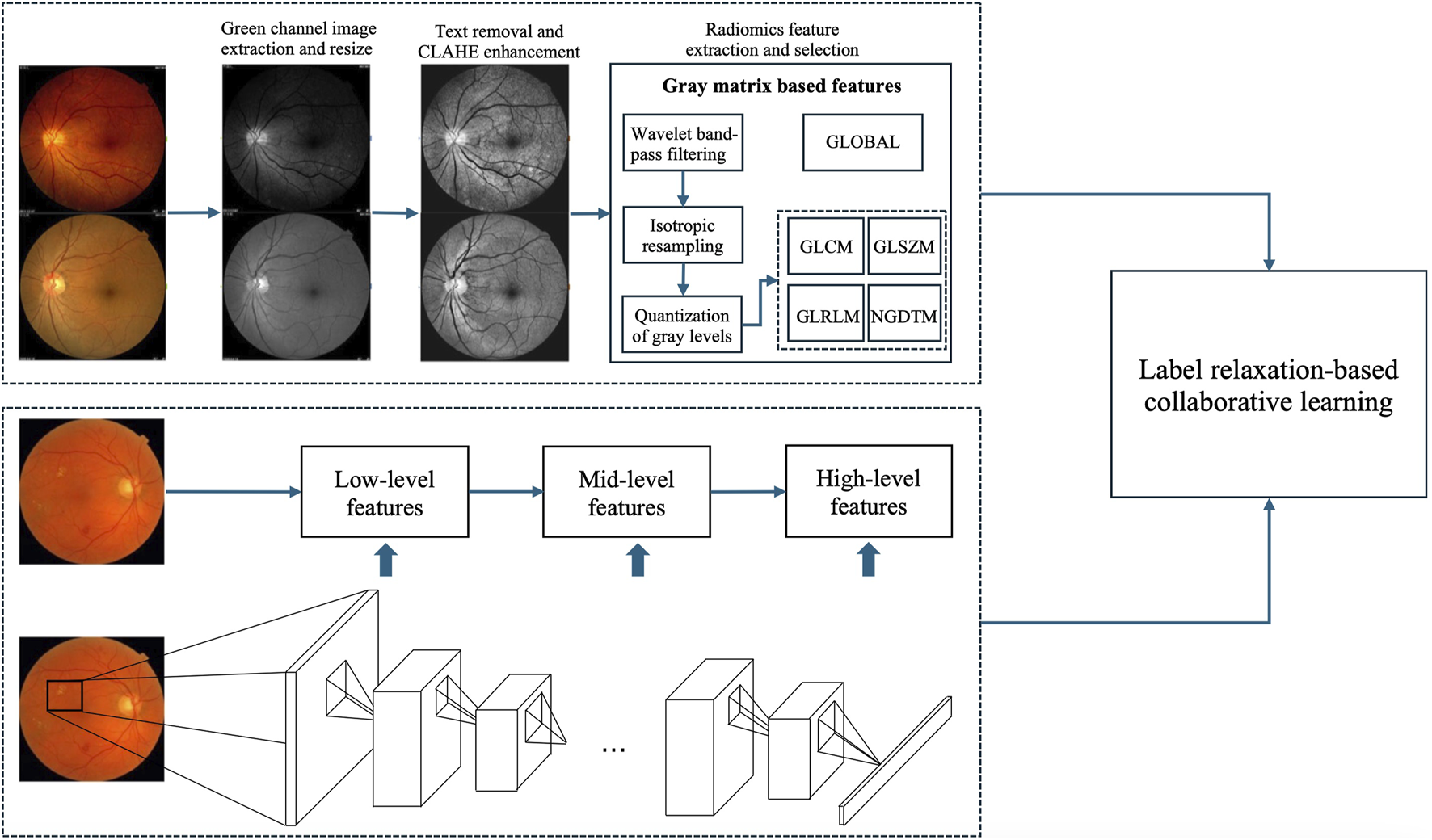 From above-mentioned studies, we can see that both hand-crafted features and deep features play significant roles in AI-aided DR grading. However, few studies focus on how to mine the complementary or consistent patterns from them to improve DR grading performance. In multi-view learning, it has been demonstrated that mining complementary or consistent patterns from different views can improve the classification performance. Therefore, in this study, we utilize convolutional neural networks to extract high-level deep features from color fundus photographs and employ radiomic methodologies to extract radiomic features. Then we design a label relaxation-based collaborative learning algorithm for high-level deep feature and radiomic feature fusion. That is to say, high-level deep features can be considered as one view, radiomic features can be considered as another view. The method aims to mine the complementary or consistent patterns from the two views.