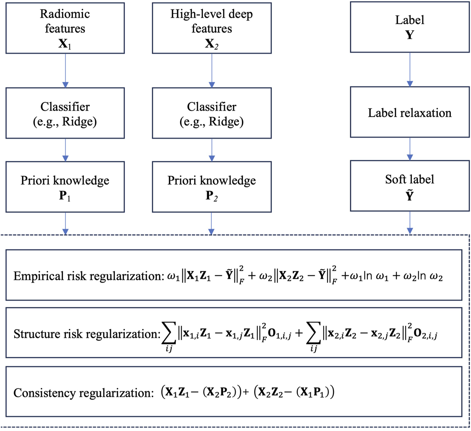 The core idea of LRCL is illustrated in Figure 3. From Figure 3, we see that two regularizations are used to reach the goal of collaborative learning. The first one is view-weighting. Specifically, “Shannon entropy” is used to automatically learn the weight of radiomic features and the weight of high-level deep features. The view weights are then embedded into empirical risk calculation. The second one is the consistency regularization which is used to mine the consistent patterns across radiomic features and high-level deep features. Specifically, we firstly train a classifier, e.g., Ridge on the radiomic feature space and the high-level deep feature space, respectively, then the trained parameter on each feature space, e.g., the transformation matrix in Ridge is taken as priori knowledge for the following consistent pattern mining. Then in the stage of consistent pattern mining, we construct a consistency regularization, as shown in Figure 3, to keep the consistency across the two feature space.