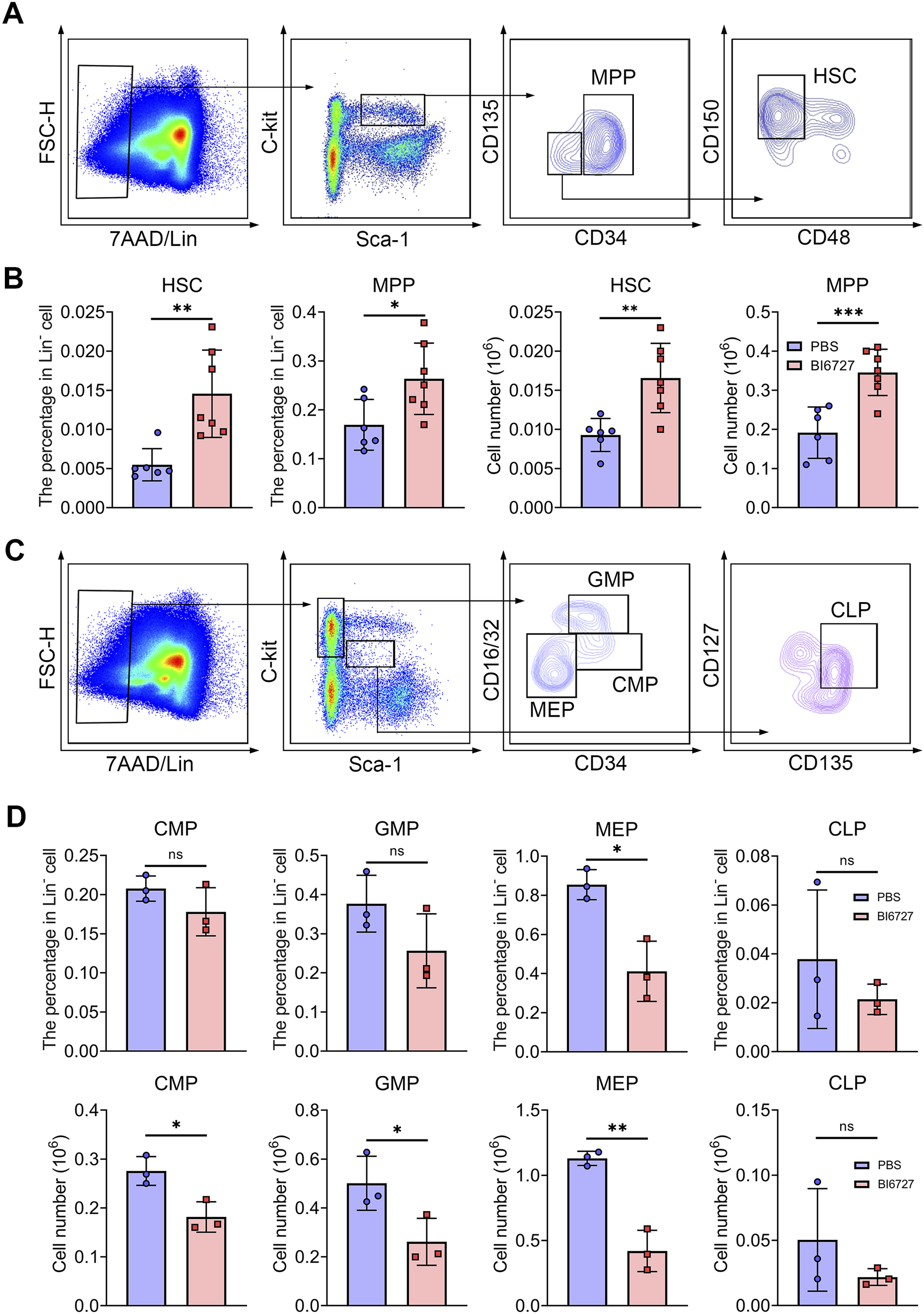 PLK1 inhibition disrupts the maintenance and development of HSPCs. (A) Representative flow cytometry plots illustrating the analysis strategy for the LSK+ population in mice BM. LSK+: Lin−Scal1+c-Kit+. (B) Percentage and absolute numbers of HSCs and MPPs in theBM of mice treated with PBS or BI6727. (C) Representative flow cytometry plots illustrating the analysis strategy for the LSK− population in mice BM. LSK−: Lin−Scal1−c-Kit+. (D) The percentage and absolute numbers of CMPs, GMPs, MEPs, and CLPs in BM. N = 3–7. *P < 0.05, **P < 0.01, ***P < 0.001. N.S.: no statistic different.