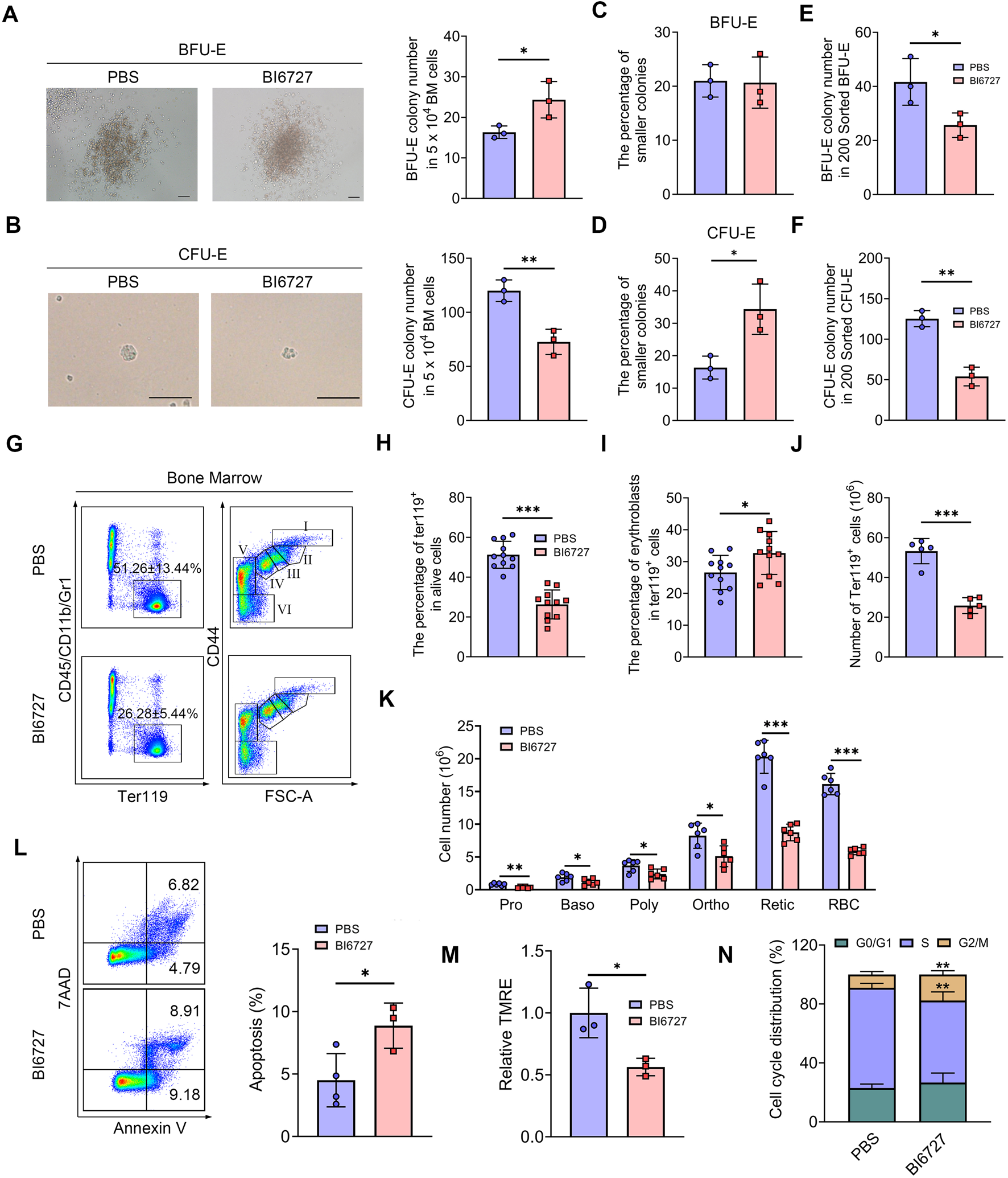 PLK1 inhibition impairs mice erythroid cells differentiation. (A, B) Representative images of BFU-E and CFU-E colonies in mice. (C, D) Quantitative analysis of the number and size of BFU-E and CFU-E colonies formed by plated BM cells from BI6727-treated and control mice. (E, F) BFU-E and CFU-E colonies formed from sorted BFU-E and CFU-E cells. (G) Representative flow cytometry plots of BM erythropoiesis in mice. I: Pro; II: Baso; III: Poly; IV: Ortho; V: Retic; VI: RBC. (H, I) Percentage and absolute number of BM Ter119+ cells. (J, K) The percentage and absolute number of BM erythroblasts. (L) Flow cytometric gating strategy for identifying apoptotic BM erythroid cells using 7AAD and Annexin V. Quantitative analysis of apoptosis in Ter119+ BM cells. (M) Assessment of MMP in erythrocytes. (N) Quantitative analysis of cell cycle distribution in BM erythroid precursors. N = 3–11. *P < 0.05, **P < 0.01, ***P < 0.001.