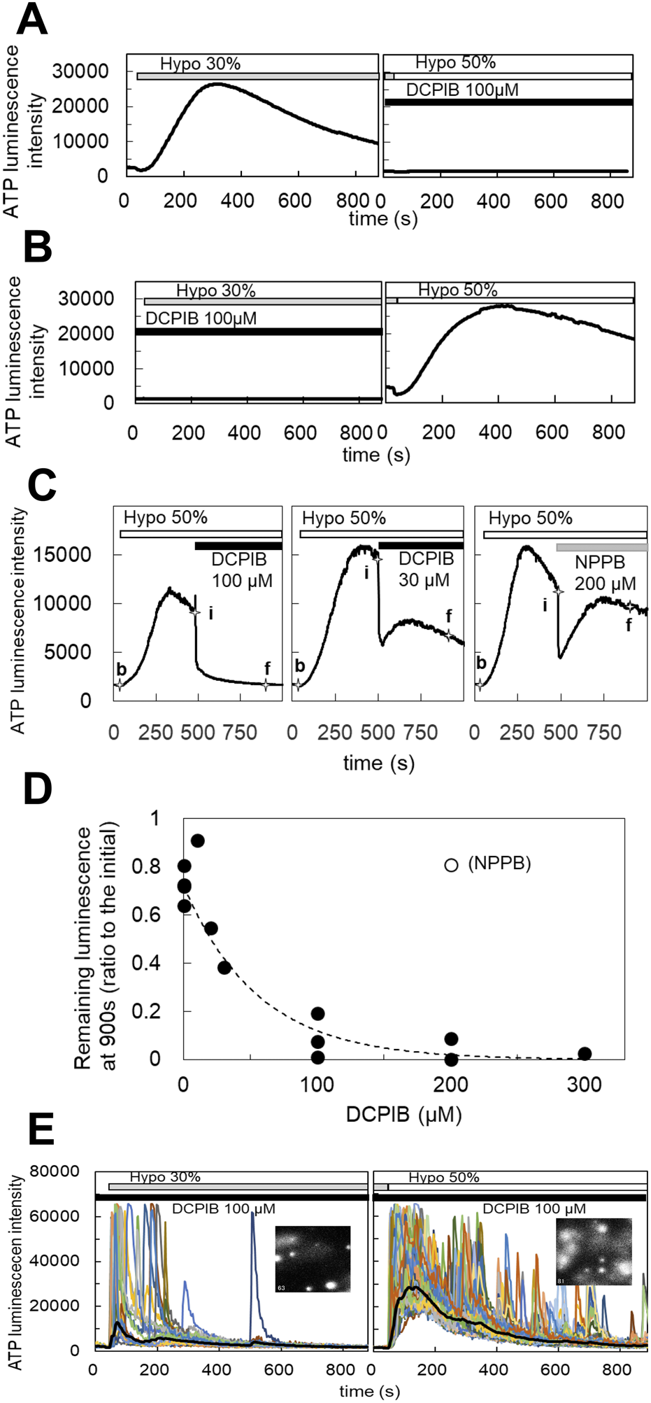 DCPIB, a blocker of the volume-regulated anion channels (VRACs), inhibited the slow diffuse response but not the sharp intermittent release. (A) Hypotonic stress (30%) induced the diffuse ATP release pattern in MCF10A cells. DCPIB treatment (100 µM) suppressed the response to subsequent 50% hypotonic stress. (B) DCPIB treatment (100 µM) suppressed the response to 30% hypotonic stress in MCF10A cells. After washout of DCPIB by several medium changes over 15 min, the ATP response recovered with subsequent 50% hypotonic stress. (C) The dose dependence of DCPIB in blocking diffuse ATP release were measured according to the level of decay of the diffuse ATP response after treatment with each concentration of DCPIB in MCF10A cells. The diffuse ATP release induced by 50% hypotonic stimulation (at 30 s; baseline intensity: b) was blocked by the perfusion of each concentration of DCPIB (at 480 s; initial intensity: i). The levels of decay were measured at 900 s (final intensity: f). Left trace: DCPIB 100 μM. center: DCPIB 30 μM. right: NPPB 200 µM. The blocking effect of DCPIB at each concentration was calculated based on the value of (f-b)/(i-b). (D) The dose dependence was determined based on the calculated value (f-b)/(i-b) at each concentration of DCPIB. The IC50 obtained by an exponential fitting curve was 38.5 µM. NPPB showed almost no effect, even at 200 µM. (E) The transient-sharp response in cholera toxin (100 ng/mL)-treated cells (MCF10A) was not affected by DCPIB treatment (100 µM) (see also Supplementary Movie S5). Other breast cell lines (MCF7, MDA-MB231) showed similar results.