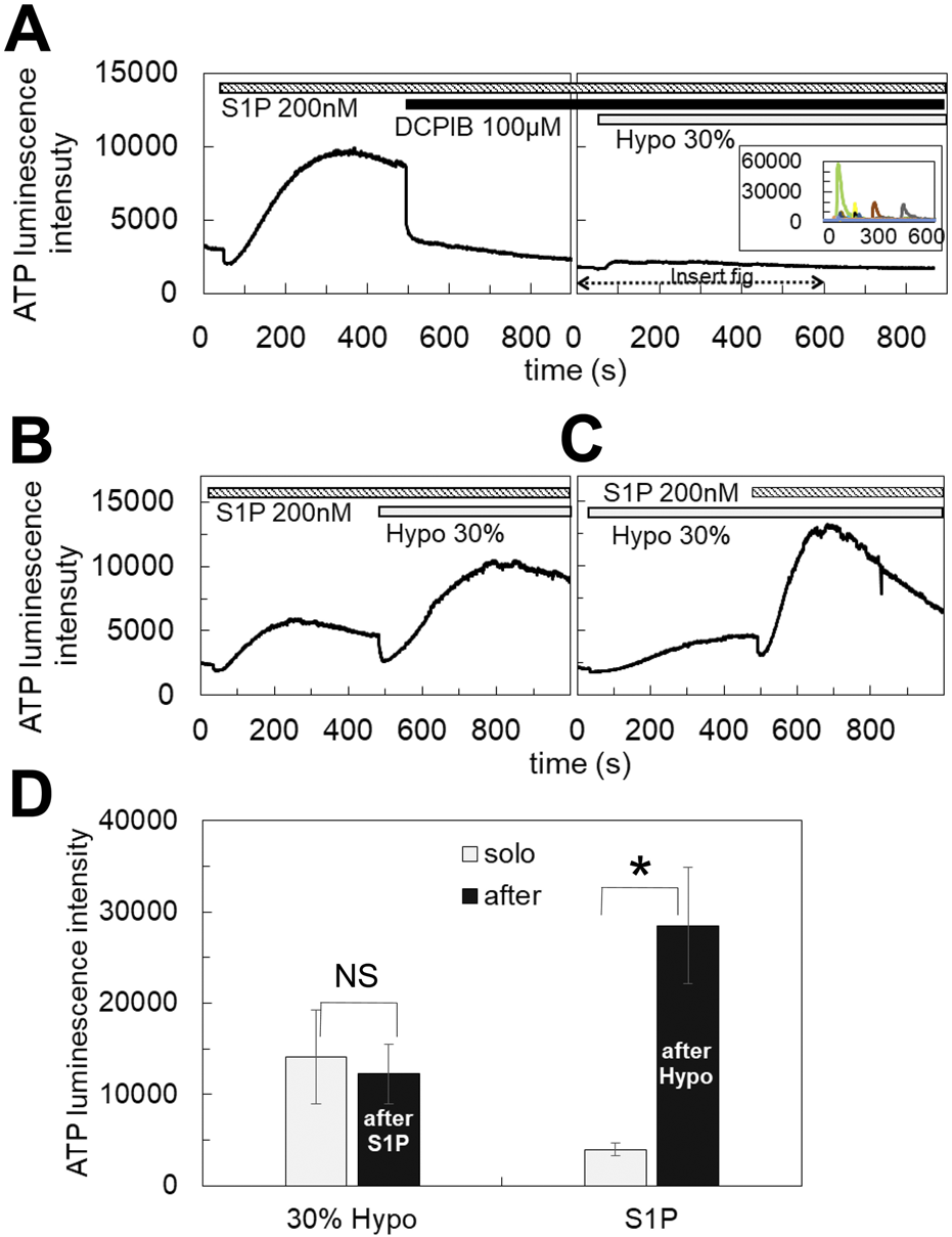 S1P induced the diffuse ATP release, which was blocked by DCPIB. (A) The application of S1P (200 nM) induced the diffuse ATP release pattern in MCF7 cells and DCPIB suppressed the response. The small response induced by 30% hypotonic stimulation after DCPIB treatment was due to the average of several intermittent sharp responses, as shown in the insert figure, which were occasionally induced by hypotonic stress in DCPIB-treated cells. (B, C) The response to S1P was additive to the effect of 30% hypotonic stimulation. Especially the response to S1P after 30% hypotonic stress was significantly enhanced in comparison to the sole administration of S1P (D). Mean ± S.E. (N = 7), t-test; NS: no significance, *: p < 0.01.