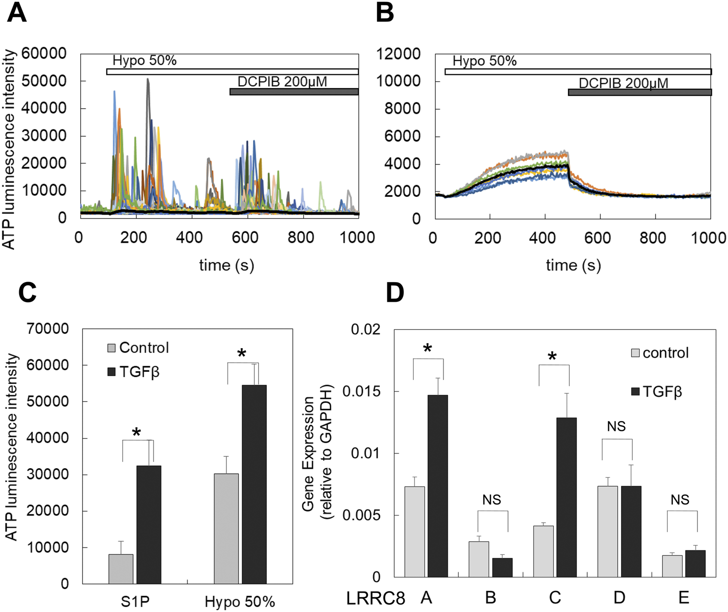 TGFβ treatment induced or enhanced the diffuse ATP release pattern and increased the expression of LRRC8 isoforms. (A) In primary cultured cells, the transient-sharp ATP release was typically induced by hypotonic stimulation (50%), and DCPIB did not block this release; rather, it enhanced the transient sharp ATP release. (B) After TGFβ treatment (10 ng/mL for 2 days) of sister cultured cells obtained from the same plating as A, the ATP release by hypotonic stress changed to the diffuse pattern, and DCPIB effectively blocked this ATP release. (C) In breast cell lines, TGFβ enhanced the diffuse ATP release induced by both S1P and hypotonic stress. The peak intensity of ATP luminescence induced by S1P and hypotonic solutions was measured in each cell line, comparing control and TGFβ-treated cells (as shown in Supplementary Figure S2A). A plot of the average of all data from 3 cell lines indicates that TGFβ treatment significantly enhanced the diffuse release of ATP by both S1P and hypotonic stress. Mean ± S.E. (N = 12), t-test; *: p < 0.001. (D) The LRRC8 isoforms ,(A, B, C, D, E) expressed in breast cell lines and TGFβ treatment enhanced the expression. The levels of these isoforms in both control and TGFβ-treated cells were measured using RT-qPCR and normalized to GAPDH for each sample. All data from 3 cell lines were averaged. Differences among the cell lines are presented in Supplementary Figure S2B. Mean ± S.E. (N = 9), t-test; NS: no significance, *: p < 0.01.