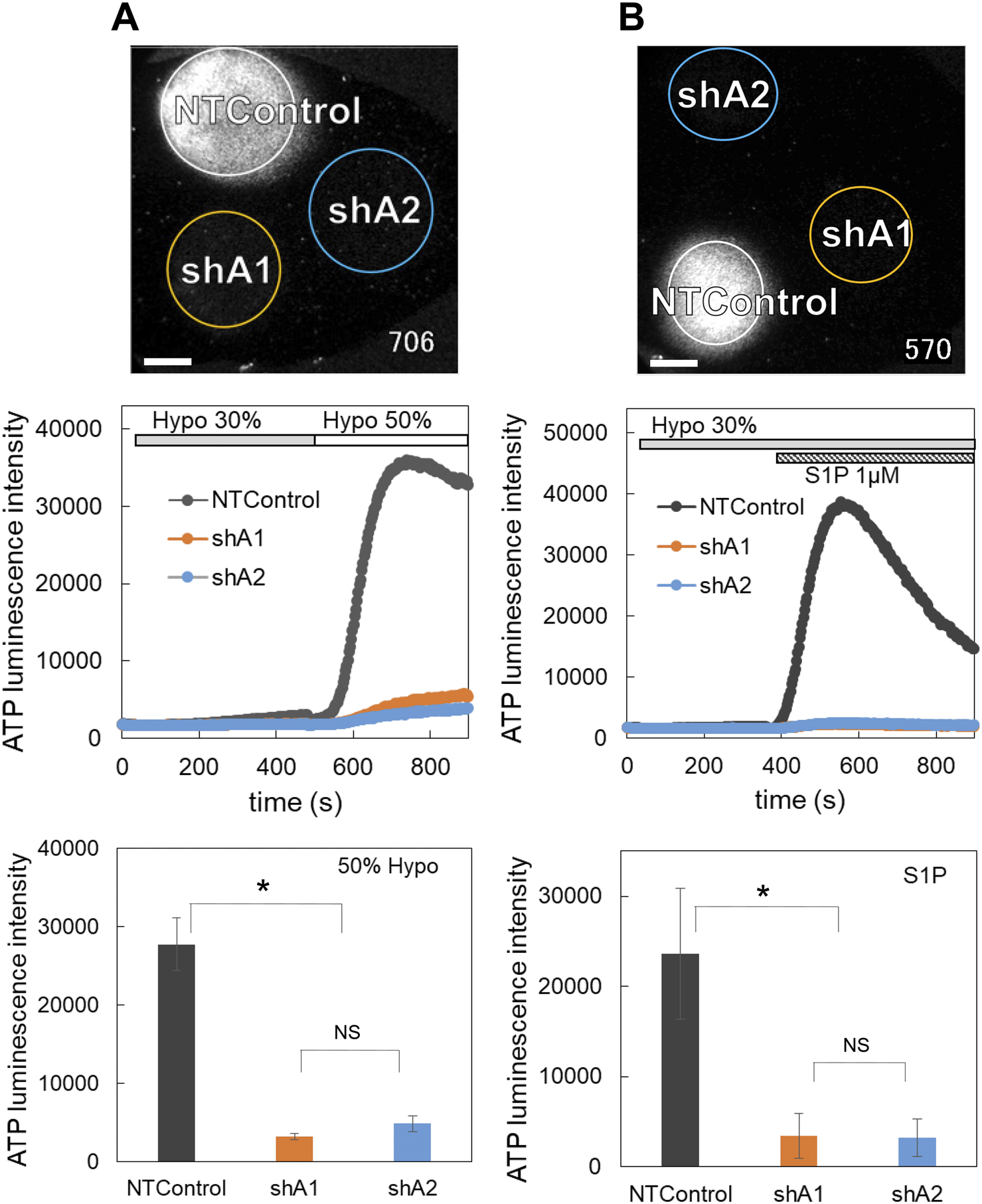 The knockdown of LRRC8A suppressed the diffuse ATP release induced by both hypotonic stress (A) and S1P (B). (A) ATP release induced by hypotonic stress (30% and 50%, applied sequentially) was measured in the cells transfected with two shLRRC8A vectors (shA1 and shA2) and NTControl simultaneously, which were cultured on a cover glass (upper image and Supplementary Movie S6). Scale is 2 mm. Middle trace is the time course of measured luminescence intensity. An example of MCF10A cells. Other cell lines (MCF7, MDA-MB231) showed similar results. Lower graph shows suppression effects of shA1 and shA2 on the ATP release induced by hypotonic stress (50%). Summary of all data from every cell lines. Mean ± S.E. (N = 15), t-test; *: p < 0.001. (B) ATP release induced by S1P (1 μM) subsequent to 30% hypotonic stress was measured in the cells transfected with two shLRRC8A vectors (shA1 and shA2) and NTControl simultaneously, which were cultured on a cover glass (upper image and Supplementary Movie S7). Scale is 2 mm. An example of MCF7 cells. Middle trace is the time course of measured luminescence intensity. Other breast cell lines (MCF10A, MDA-MB231) showed similar results. Lower graph shows suppression effects of shA1 and shA2 on the ATP release induced by S1P. Summary of all data from every cell lines. Mean ± S.E. (N = 6), t-test; *: p < 0.01.