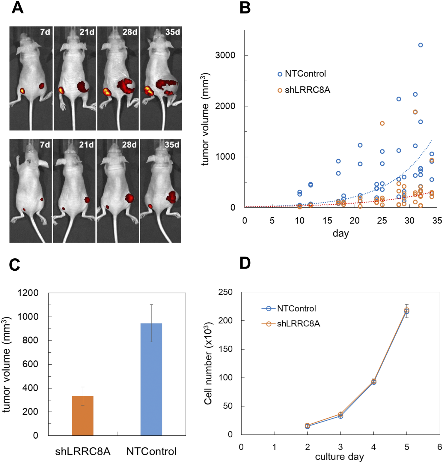 LRRC8A knockdown suppressed the cancer progression in nude mouse xenograft model. (A) GFP-expressing MDA-MB231 cells were subcutaneously injected into the lower back of nude mice, and tumor progression was monitored using fluorescence with an in vivo imaging system (IVIS Spectrum). LRRC8A knockdown cells (shA1) were injected on the left side, while NTControl cells were injected on the right side. A total of 1 × 106 cells (1 × 107 cells/mL, 100 µL) were injected for each condition. Two representative mice (out of 16 total) exhibiting tumor growth over time are shown. (B) The tumor size, measured transdermally using a digital caliper, was plotted against the day following injection. Tumor volume was estimated as an ellipsoid using equation L*W2*4pai/3/8 (where L: length, W: width). This data encompasses all tested mice (4 experiments, 4 mice per experiment, over a duration of 7–35 days). The broken lines indicate the curves of exponential fitting for both cases, with τ values of 7.65 for the control and 11.4 for the knockdown cells. (C) The average tumor sizes at days 28–34 were compared. The tumor volume with LRRC8A knockdown cells was significantly smaller than that with NTControl cells (n = 24, p = 0.0011, t-test). (D) The growth rate of each cell in culture did not differ between LRRC8A knockdown cells and NTControl cells. The number of cells in each culture dish was counted daily using a hemocytometer following dissociation. N = 3.