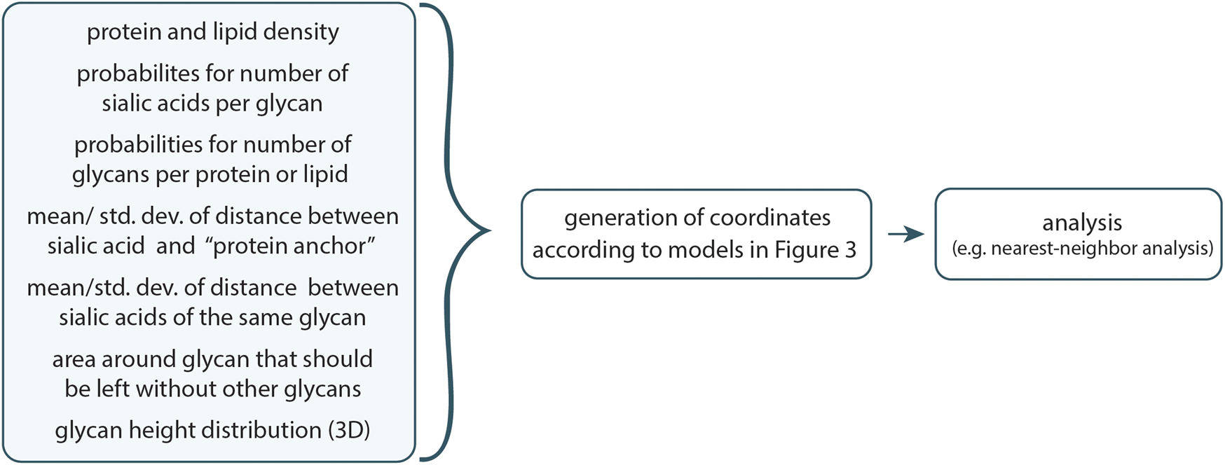 Workflow of the program. With the help of geometrical input, which can be easily tailored for each unique use-case, a possible set of coordinates of sialic acids is generated according to the models depicted in Figure 3. These coordinates can then be examined further, such as through a nearest-neighbor analysis.