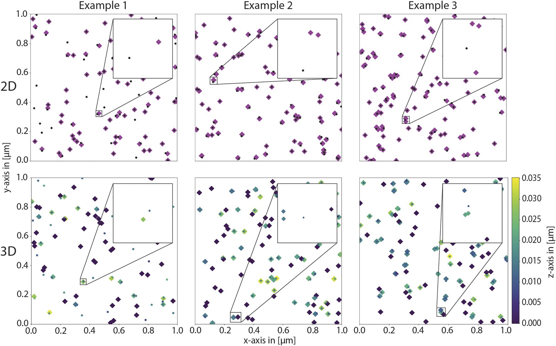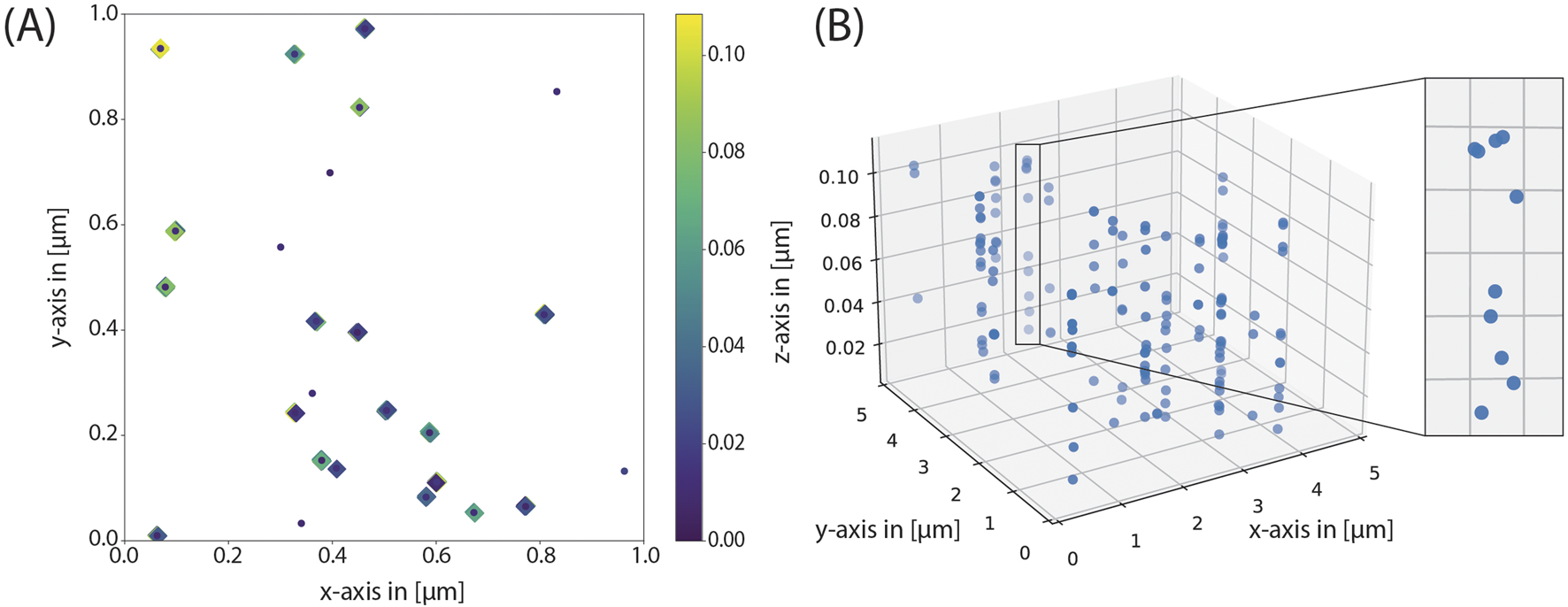 To start a simulation, all input variables are manually adjusted in the “variables.py” file. The simulation can then be started in “main.py” using the routine() or the routine_3d() function. Their parameters can determine whether or not to save and plot the coordinates and (if applicable) their analysis, whether to analyze and if so for which labeling efficiencies and how often the array should be randomly reduced for each labeling efficiency. One can also change how many times the simulation should be repeated and, in addition, the default nearest neighbor distance from 1 to an arbitrary higher degree can be set. If several simulations are desired without the necessity of manual adjustment in between runs, the function change_variable() is useful, as it not only changes the content of the variables, but also writes the new values to the variable document, which is saved with each simulation round. At the beginning of each routine, the inputs are checked for logical errors to ensure that for example, the probability arrays indeed sum up to one.