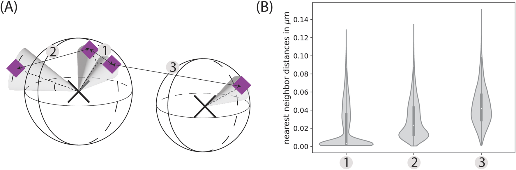 Characteristic distances. (A) Biologically, there are three characteristic distances: The distance between two sialic acids belonging to the same glycan (1), the distance between two sialic acids belonging to two different glycans located on the same protein (2), and the distance between two different glycoproteins (3). (B) These peaks can then be seen in the nearest neighbor distributions of coordinates simulated specifically to highlight these characteristic distances. The distributions are here depicted as violin plots with a corresponding box-plot in the middle, which indicates the median as well as the upper and lower quartile. The width of the distributions widens with increasing distance, as the distributions become less defined. While the peak of (1) corresponds to the distribution of mu_sias and sigma_sias, (3) varies greatly depending on the random distribution of the glycoproteins. The simulation parameters were set to a protein density of 125 µ and a lipid density of 625 µ within a 5 × 5 µm FOV. In (1) 70 % of the proteins have exactly 1 glycan, the rest none. Of these glycans, again 70 % have exactly two sialic acids, the rest none. In (2) 70% of proteins have two glycans and these glycans have a probability of 70 % for exactly one sialic acid. In the rest of the cases there are no glycans or sialic acids, respectively. In (3) 70% of the proteins have one glycan with one sialic acid in 70 %. The rest of the parameters is identical to Supplementary Table S2.
