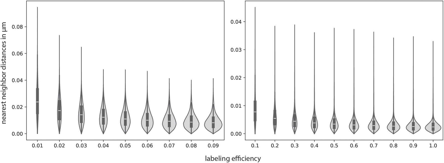 Sialic acid nearest neighbor distances simulated with biologically realistic parameters. The parameters were partly determined with GlycoSHIELD (Tsai et al., 2024) and vmd (Humphrey et al., 1996). All simulation parameters can be found in Supplementary Table S2. The nearest neighbor distributions are depicted as violin plots with a corresponding box-plot in the middle, which indicates the median as well as the upper and lower quartile. While the lowest nearest-neighbor distances stay approximately the same, the highest increase for lower labeling efficiencies, as expected.