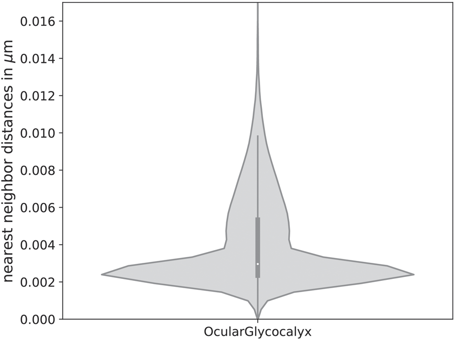 Nearest neighbor distribution of sialic acids on the ocular glycocalyx. The maximal values were cut in the diagram but lie at 0.046 µm and are due to the relatively sparsely set number of glycolipids with sialic acids, which are in rather high distance to other sialic acids. We simulated an equal distribution of three different mucin lengths of 50, 250 and 500 nm and 28, 139 and 178 glycans, respectively.
